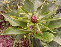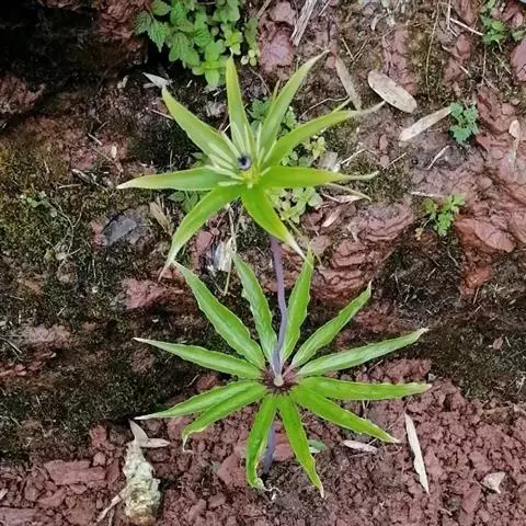 ⑤ 滇王孙,又名:金沙重楼多年生草本,高30~50厘米。叶6~9片,长椭圆形至椭圆状披针形,长6~10厘米,宽1.5~2.5厘米。花柄短于叶片,长2~7厘米;外列被片4~5瓣,披针形,长2~3厘米,宽约5毫米,内列被片4~5瓣,狭线形,长约1厘米,暗紫色;雄蕊6~10,赤紫色,花药线形,药隔暗褐色,于花药顶端延伸约3毫米;子房有时具翼,花柱4或5枚。花期5~6月。分布云南、四川。