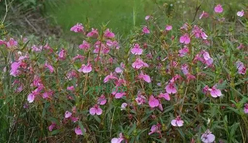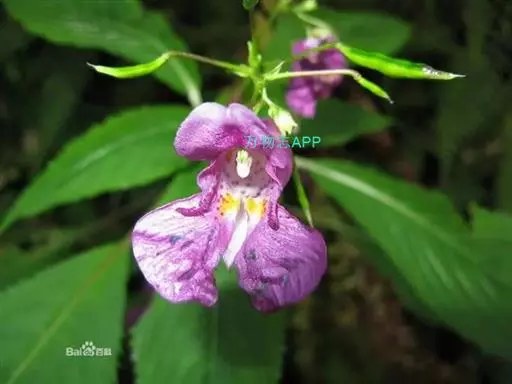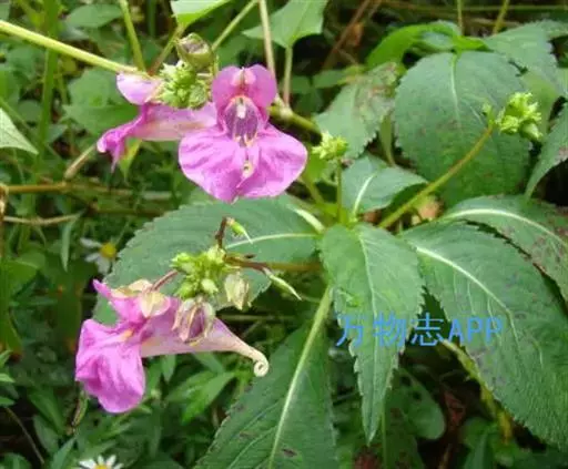 华凤仙(学名:Impatiens chinensis Linn.):凤仙花科,凤仙花属一年生草本植物,高可达60厘米。茎纤细,无毛,叶对生,叶片硬纸质,稀倒卵形,上面绿色,被微糙毛,下面灰绿色,无毛,花较大,1-3朵簇生于叶腋,紫红色或白色;苞片线形,唇瓣漏斗状,旗瓣圆形,翼瓣无柄,花丝线形,花药卵球形,子房纺锤形,蒴果椭圆形,种子黑色圆球形有光泽。