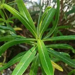 叶对生,无柄或几无柄;叶片硬纸质,线形或线状披针形,稀倒卵形,长2-10厘米,宽0.5-1厘米,先端尖或稍钝,基部近心形或截形,有托叶状的腺体,边缘疏生刺状锯齿,上面绿色,被微糙毛,下面灰绿色,无毛,侧脉5-7对,不明显。