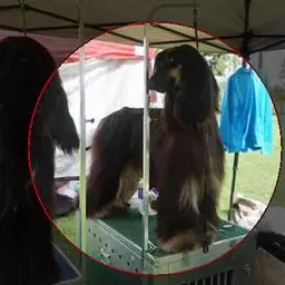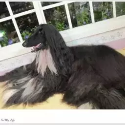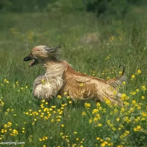 阿富汗猎犬全身披丝绢状的长毛,毛色鲜艳,呈多种颜色,背中线附近毛短,…