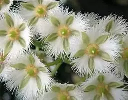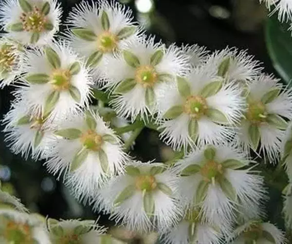 总状花序常生于无叶的前一年枝上,长5-10厘米,纤细,花序轴有微毛:花柄长5-6毫米;萼片5片,披针形,长5毫米,宽1.5毫米,外面有微毛;花瓣5片,白色,长5-6毫米,先端较宽,撕裂为14-18条,基部窄,外面无毛;雄蕊20-30枚,长3.5毫米,花丝极短,花药顶端无附属物但有毛丛;花盘5裂,被毛;子房2-3室,被毛,花柱长3-5毫米,有微毛。核果椭圆形,长1-1.5厘米,内果皮薄骨质,表面有浅沟纹。秃瓣杜英的花花期为7月。