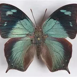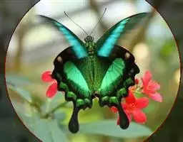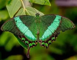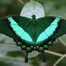 巴黎翠凤蝶中型凤蝶,躯体黑褐色,散布绿色亮鳞。后翅M3脉端有一明显叶状尾突。翅背面底色黑褐色,密布…