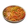 4、蛋糕模(用了一个圆型的小饭盒)内铺上保鲜膜,将拌好的饼碎铺进去,压平