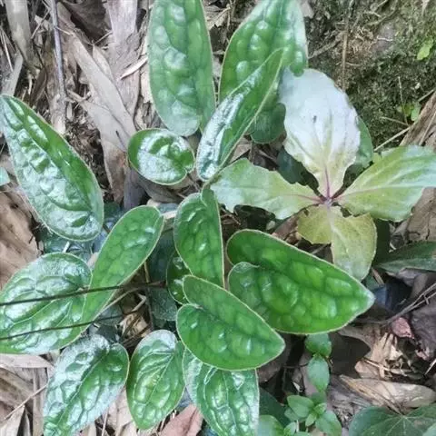 宽叶兔儿风(17张) 多年生草本。根状茎粗壮,直或弧曲状,直径5-10毫米,根颈密被污黄色或黄白色绵毛;根簇生,细弱,纤维状。茎直立,不分枝,高30-80厘米,直径2-4毫米,薄或密被蛛丝状白色绵毛。叶聚生干茎基部的呈莲座状,叶片薄纸质,卵形或狭卵形,大者长可达10-11厘米,宽5-6.5厘米,小者长仅3厘米,宽1-1.5厘米,顶端短尖或钝,基部缢缩下延于叶柄成阔翅,边缘有胼胝体状细齿,上面疏被长柔毛,稀脱落近无毛,下面密被白色绒毛和杂以同色、稍硬的长毛,长毛于脉上尤密;基出脉3条,侧生的1对其外侧常有几条细的分枝,斜上升于叶片上部离缘弯拱网结,中脉中部以上的1-3对侧脉细弱,弧形上升,网脉明显;叶柄与叶片几等长,具翅,翅于下部略狭,宽5-20毫米,两面均被与叶片相同的毛;茎上部的叶疏离,卵形、披针形或近长圆形,长2-2.5厘米,花序轴上的叶更小,苞片状,长5-10毫米,无柄或具短柄,毛被与基生叶的相同。头状花序具花3朵,长10-15毫米,单个或2-4朵聚集于苞片状的叶腋内复组成间断的、长9-38厘米的穗状花序,花序轴粗挺,被蛛丝状绵毛;总苞圆筒形,直径约3毫米;总苞片约5层,背部多少被毛,外层的卵形,长约1.5毫米,宽约1毫米,顶端钝,具1脉,中层长卵形,长约3.2毫米,宽约2毫米,顶端钝或有带紫红色短尖头,最内层椭圆形,长约8毫米,宽近2毫米,具3脉,顶端渐尖,尖头常呈紫红色,边缘薄,近膜质;花托不平,无毛,直径约1毫米。花全部两性;花冠管状,长约11毫米,檐部5深裂,裂片偏于一侧,长圆形,略长于花冠管;花药长约5.5毫米,顶端截平,基部的尾长约1.5毫米;花柱分枝扁,长不足0.5毫米,顶端钝圆。瘦果近纺锤形,长约5.5毫米,具8条粗纵棱,密被倒伏的绢质长毛。冠毛棕褐色,羽毛状,长8-10毫米,基部联合。花期4-10月。
