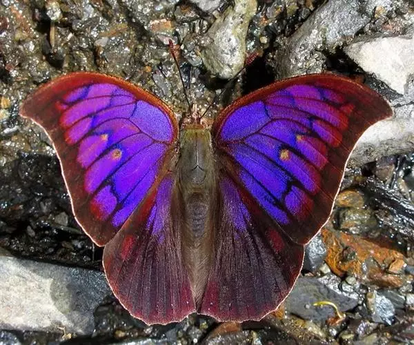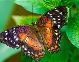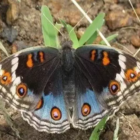 孔雀蛱蝶展翅宽50~60mm。翅膀表面红色,上、下翅有一大型彩色眼纹;翅膀腹面淡褐色,拟似烟熏枯叶…