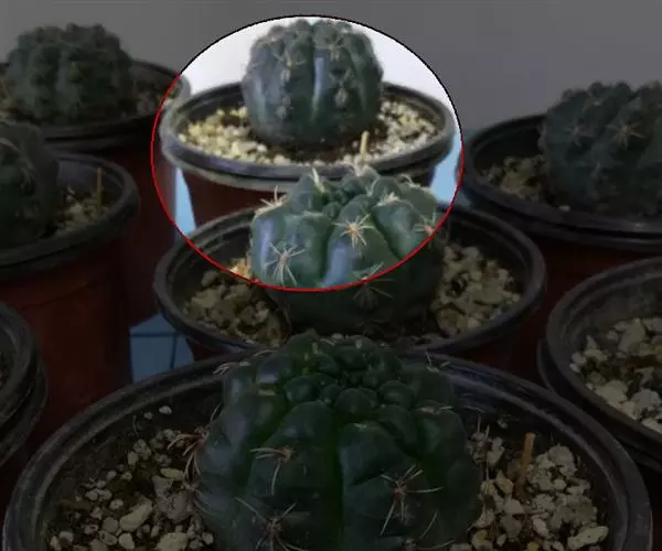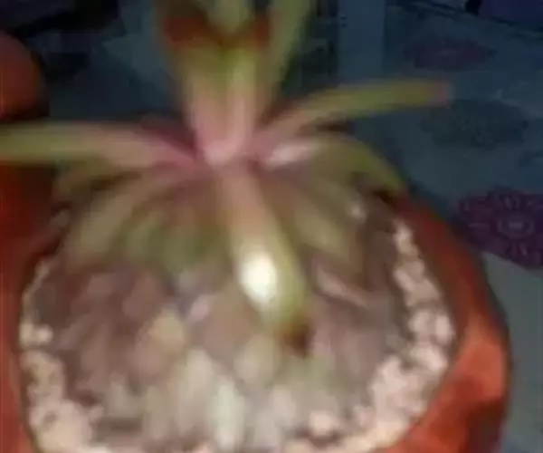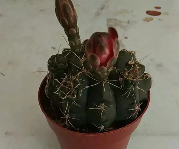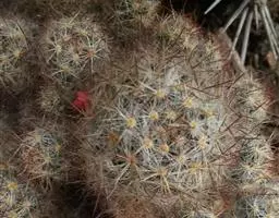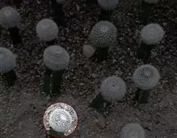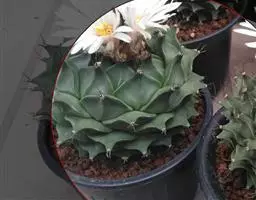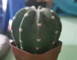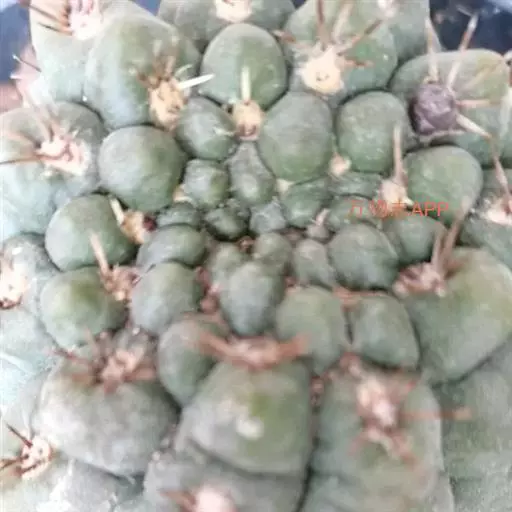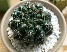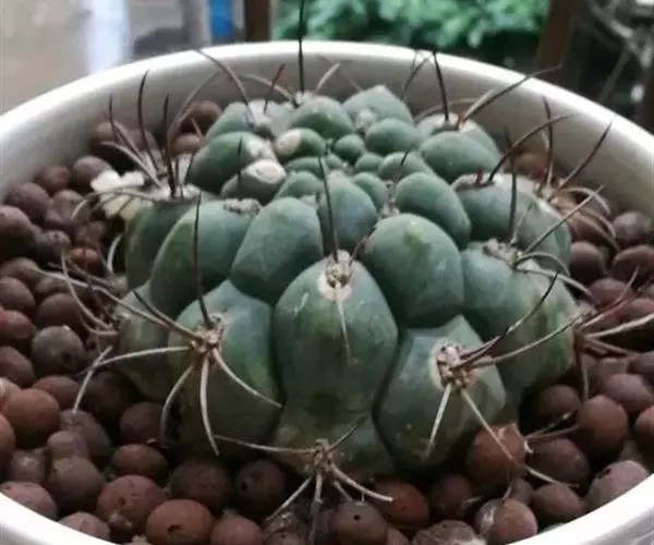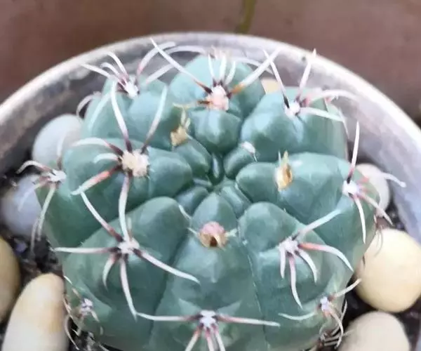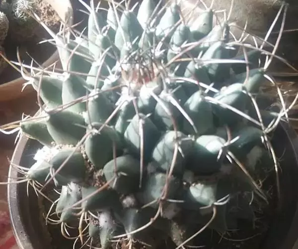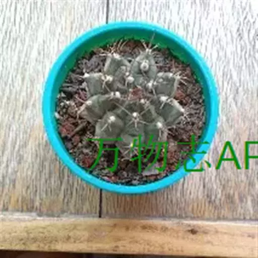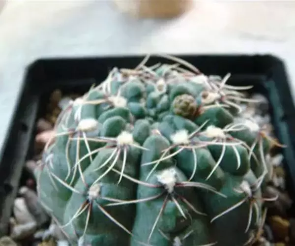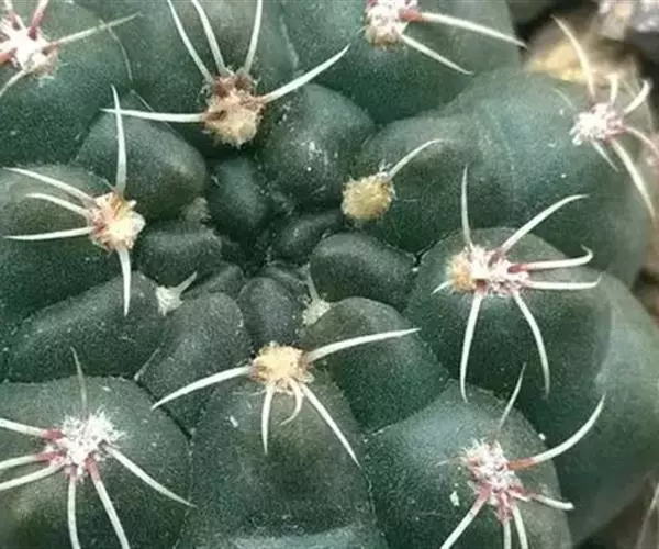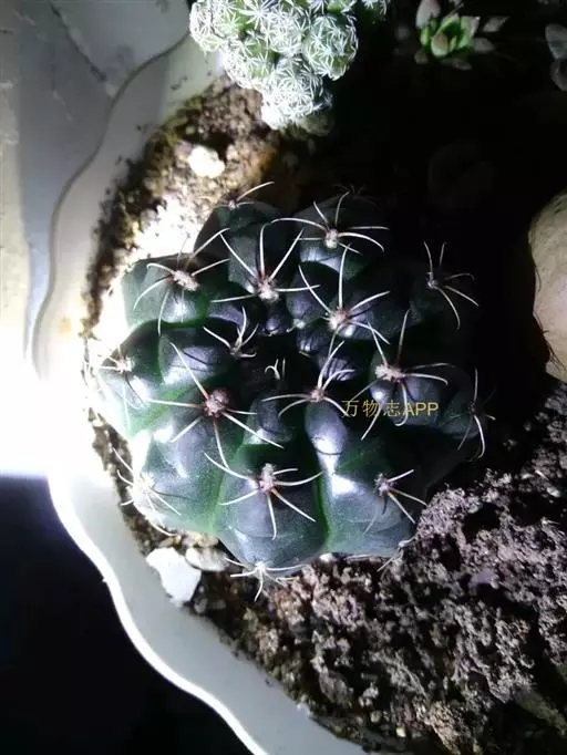 多肉植物,植株呈扁球形,直径7厘米,表皮墨绿色,具棱7-11。刺针状,每个刺座有5枚灰色周刺,中刺1枚,稍粗,灰白或褐色,最长可达1.5厘米。