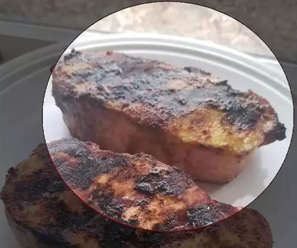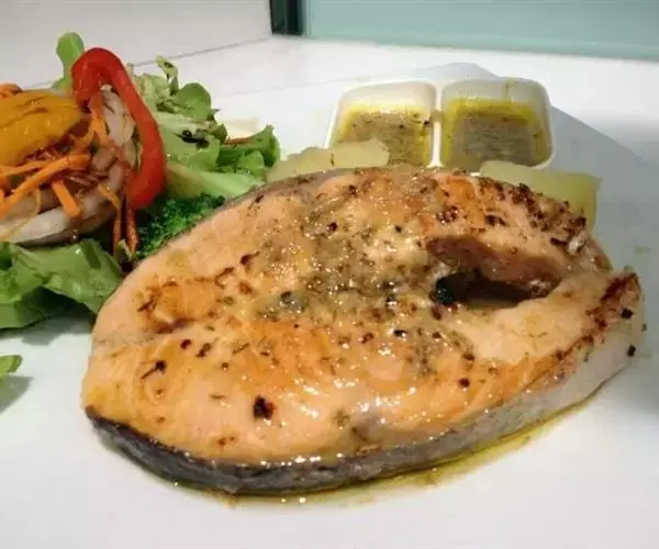 3、烤好的三文鱼油脂四溢,如果喜欢,还可以沾一些烧烤酱食用。