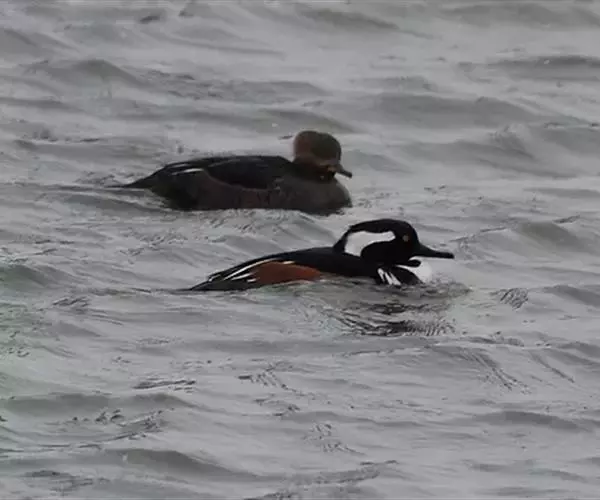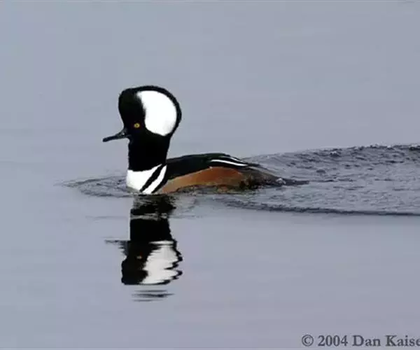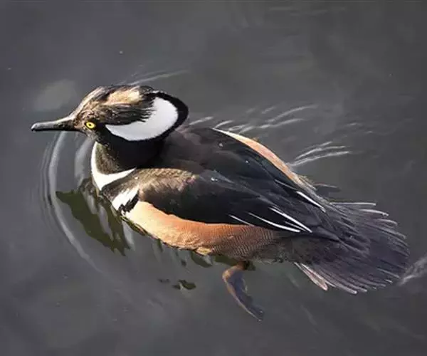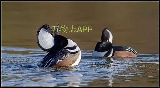 棕胁秋沙鸭体长42-50厘米,翼展56-70厘米。是北美最小的水鸭。雌雄相异形。雄鸭长得相当英俊,有红棕色的庞克(Punk)头,头羽隆成脊状时有大片的白色斑羽和界限分明的黑边,休息时就会变成眼睛背后一种简单的白色宽条纹斑;头部与白帽鹊鸭相似,但身上斑纹较多,总体石板色,有黑色,白色和棕色的羽毛组合。头部,颈部和翕为黑色;臀灰色;尾巴深褐灰色;喉咙,胸部,腹部白色。胸部两侧是黄褐色或红褐并有不规则的黑边纹。