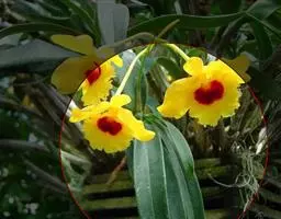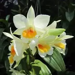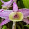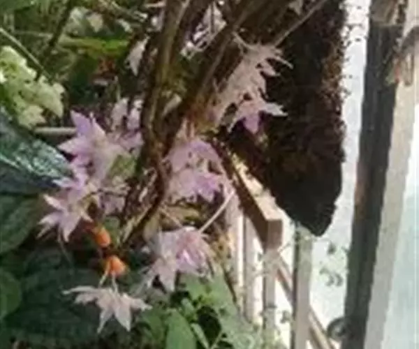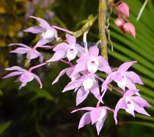 重唇石斛(学名:Dendrobium hercoglossum Rchb. f.):茎下垂,圆柱形或有时从基部上方逐渐变粗,具少数至多数节。叶薄革质,狭长圆形或长圆状披针形。总状花序通常数个,从落了叶的老茎上发出,常具2-3朵花;花开展,萼片和花瓣淡粉红色;花瓣倒卵状长圆形,长1.2-1.5厘米,宽4.5-7毫米,先端锐尖,具3条脉;唇瓣白色,直立,长约1厘米,分前后唇;后唇半球形,前端密生短流苏,内面密生短毛;前唇淡粉红色,较小,三角形,先端急尖,无毛。花期5-6月。