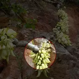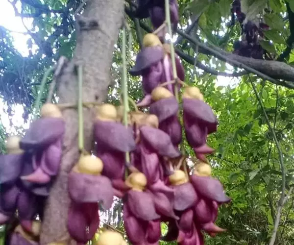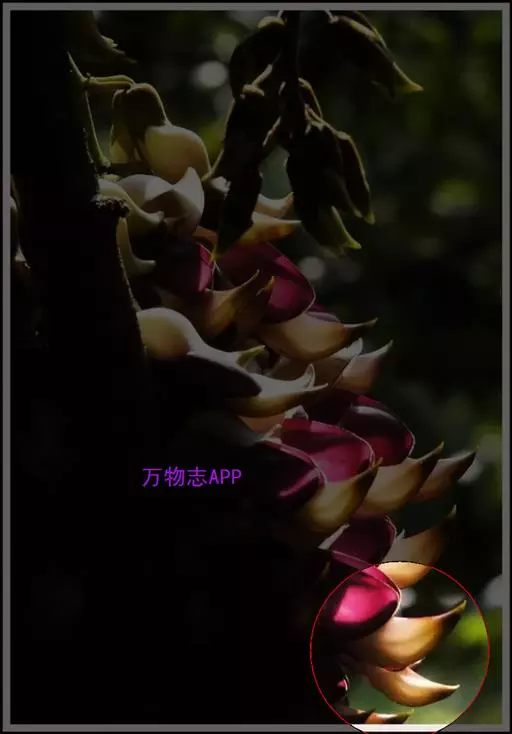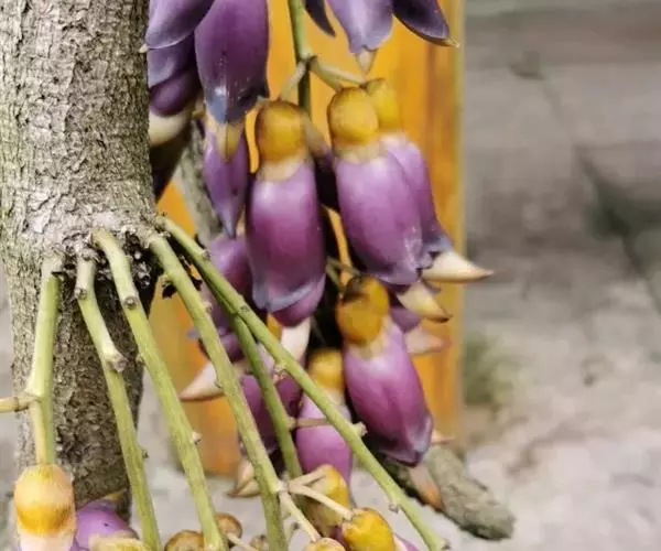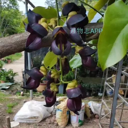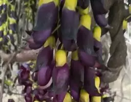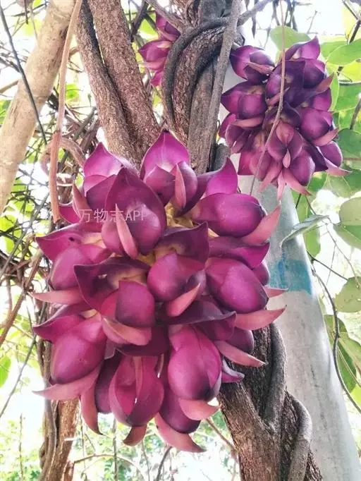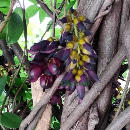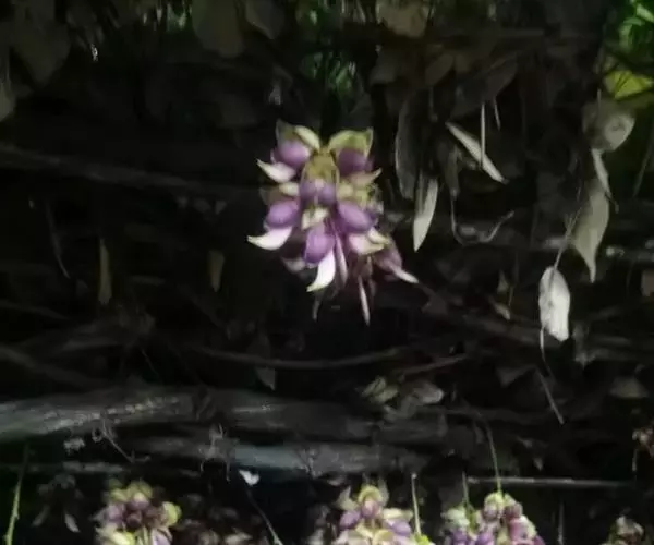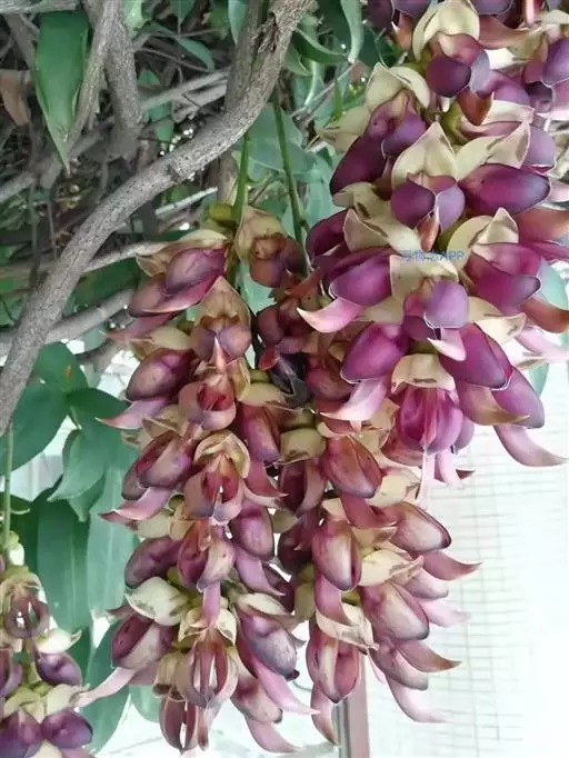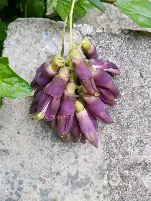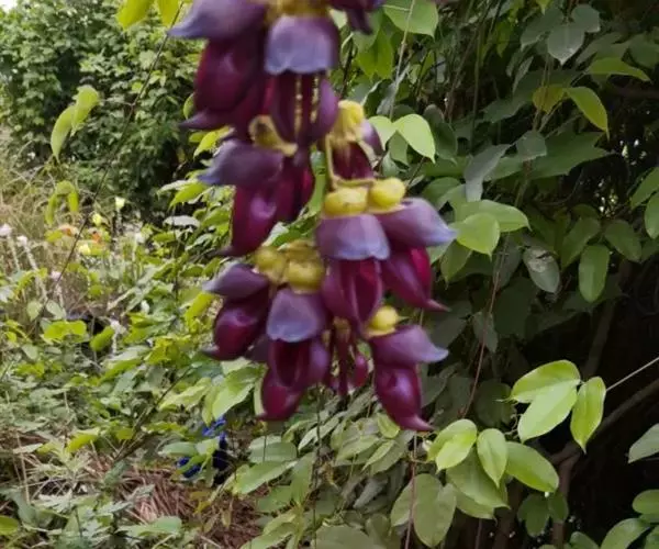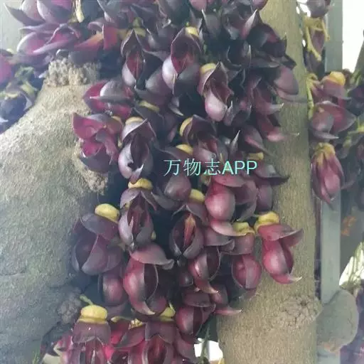 总状花序生于老茎上,长10-36厘米,每节上有3花,无香气或有臭味;苞片和小苞片不久脱落,苞片狭倒卵形,长宽各15毫米;花梗长1-2.5厘米,具短硬毛;小苞片卵形或倒卵形;花萼密被暗褐色伏贴短毛,外面被稀疏的金黄色或红褐色脱落的长硬毛,萼筒宽杯形,长8-12毫米,宽18-25毫米;花冠深紫色,干后黑色,长约6.5厘米,旗瓣长3.2-4厘米,圆形,先端凹达4毫米,基部耳长1-2毫米,翼瓣长4.8-6厘米,宽1.8-2厘米,龙骨瓣长6-7厘米,基部瓣柄长约7毫米,耳长约4毫米;雄蕊管长约4厘米,花柱下部和子房被毛。