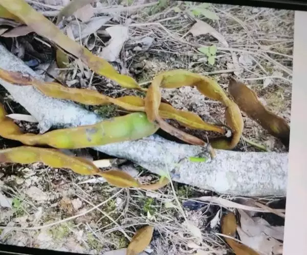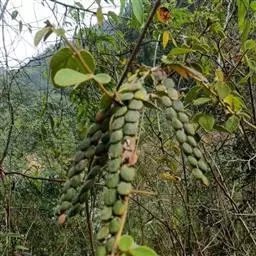 果木质,带形,长30-60厘米,宽3-3.5厘米,厚1-1.3厘米,种子间缢缩,近念珠状,边缘多数加厚,凸起为一圆形脊,中央无沟槽,无翅,具伏贴红褐色短毛和长的脱落红褐色刚毛,种子4-12颗,内部隔膜木质;带红色,褐色或黑色,扁长圆形,长约2.2-3厘米,宽2-2.2厘米,厚1厘米,种脐黑色,包围着种子的3/4。
