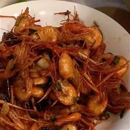 2、将炸好的虾盐、味精、料酒、炸蒜米、胡椒炒香即成。