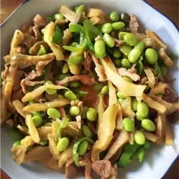 2、炒锅置旺火上,放入混合油烧至五成熟,将肉丝用酱油、水豆粉拦匀下锅,炒至肉散至发白。即下榨菜丝、葱丝一起炒匀,放入少许汤炒转起锅即成。