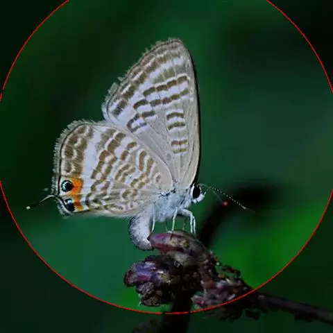 红珠灰蝶翅白色,半透明羽毛状。前翅及前缘布各有一层橙色鳞片。中室中部及横脉处各有不同大小黑色斑。…