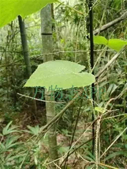 木质藤本。小枝圆柱形,纵棱纹幼时不明显,被皮刺,无毛。卷须2叉分枝,每隔2节间断与叶对生。叶卵圆形或卵椭圆形,长5-12厘米,宽4-16厘米,顶端急尖或短尾尖,基部心形,基缺凹成钝角,边缘每侧有锯齿12-33个,齿端尖锐,不分裂或微三浅裂,上面绿色,无毛,下面浅绿色,无毛,基生脉5出,中脉有侧脉4-5对,网脉明显,下面比上面突出,无毛常疏生小皮刺;托叶近草质,绿褐色,卵披针形,长2-3毫米,宽1-2毫米,无毛,早落。花杂性异株;圆锥花序基部分枝发达,长7-24厘米,与叶对生,花序梗长1-2.5厘米,无毛;花梗长1-2毫米,无毛;花蕾倒卵圆形,高1.2-1.5毫米,顶端圆形;萼碟形,边缘萼片不明显;花瓣5,呈帽状粘合脱落;雄蕊5,花丝丝状,长1-1.4毫米,花药黄色,椭圆形,长0.6-0.7毫米,在雌花内雄蕊短,败育;花盘发达,5裂;雌蕊1,子房圆锥形,花柱短,柱头扩大。果实球形,成熟时紫红色,直径1.2-2.5厘米;种子倒卵椭圆形,顶端圆钝,基部有短喙,种脐在种子背面中部呈圆形,腹面中棱脊突起,两侧洼穴狭窄,向上达种子3/4处。花期4-6月,果期7-10月。