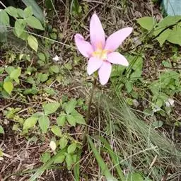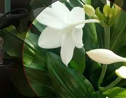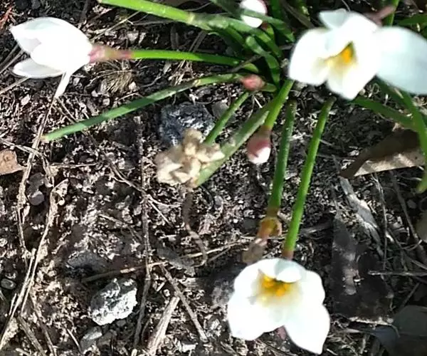 花茎中空;花单生于花茎顶端,下有带褐红色的佛焰苞状总苞,总苞片顶端2裂;花梗长约1厘米;花白色,外面常带淡红色;几无花被管,花被片6,长3-5厘米,顶端钝或具短尖头,宽约1厘米,近喉部常有很小的鳞片;雄蕊6,长约为花被的1/2;花柱细长,柱头不明显3裂。