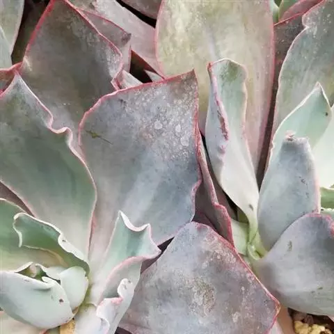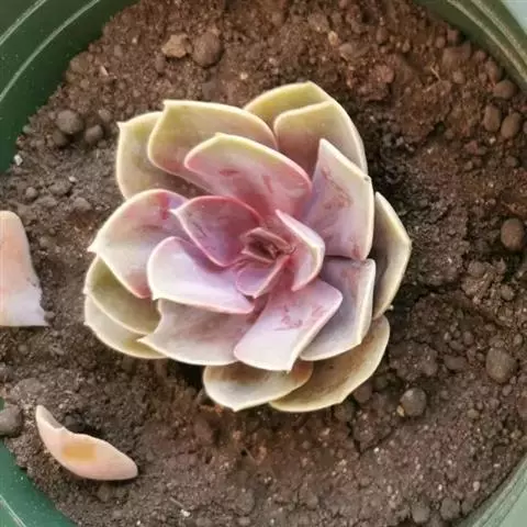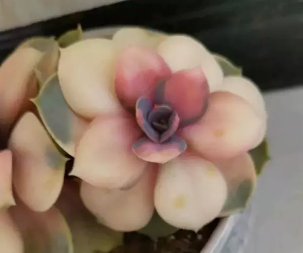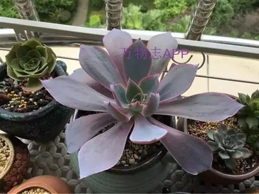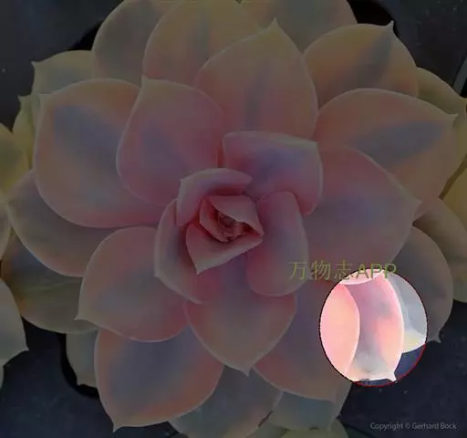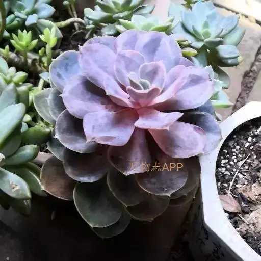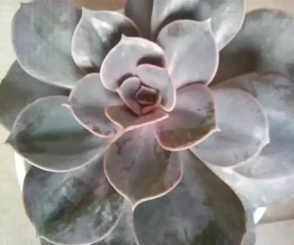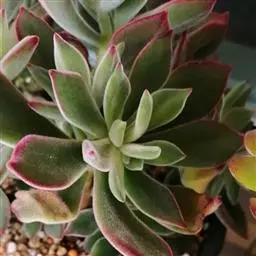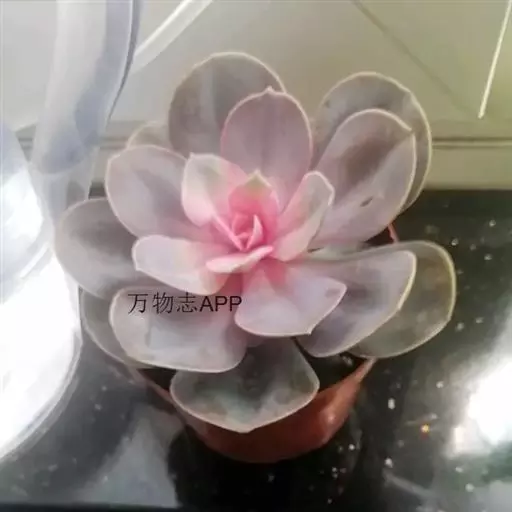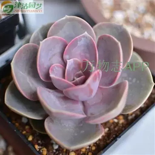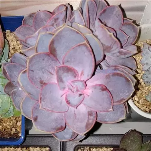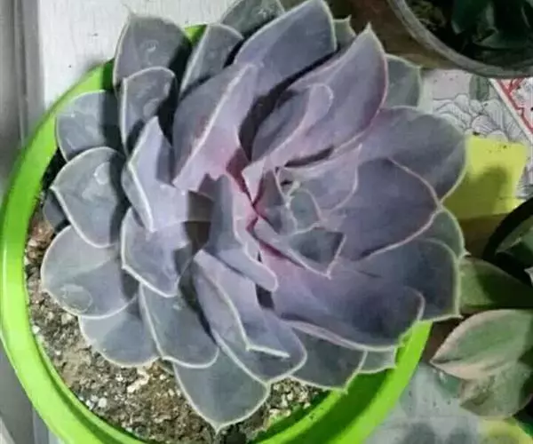 生长时绿色为主,紫色不明显,入秋后日夜温差拉大,叶片呈现美丽的粉紫色,叶缘呈白色。叶片呈莲座形螺旋排列,秋冬季观赏性最佳。放置在阳光下的话,会长成玫瑰花瓣状,使得这个品种具有非常强的观赏性。