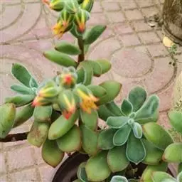 紫珍珠有一个可爱的肉质银色的光泽,并随着季节变化色调的紫红色的叶子,称得上是最美的多肉植物之一。紫珍珠花是精致的珊瑚色系,通常一个花穗上回有十几个甚至更多的小花朵。至秋凉后,在光照下紫色才渐渐加深、凸现。夏末秋初,从叶腋间抽出花茎,开略带紫色的橘红色花朵。