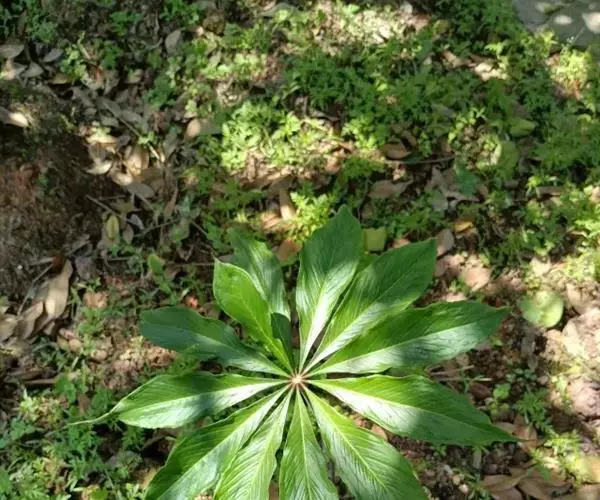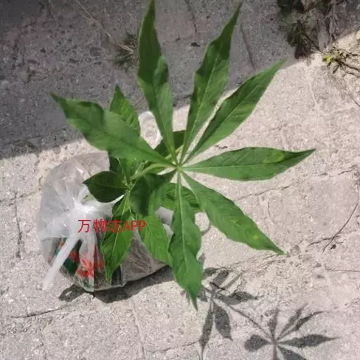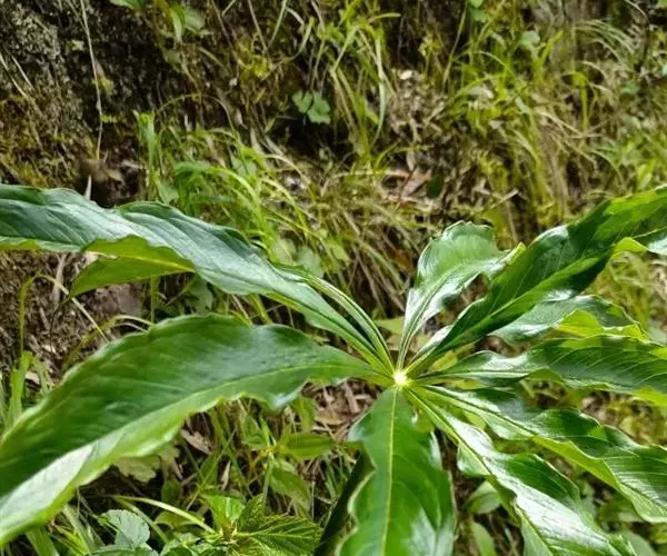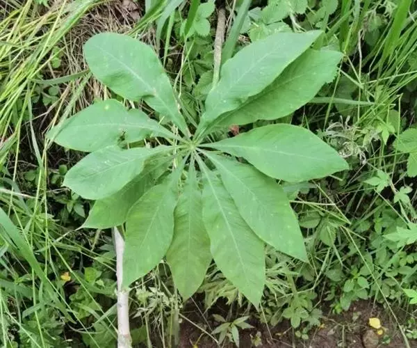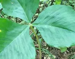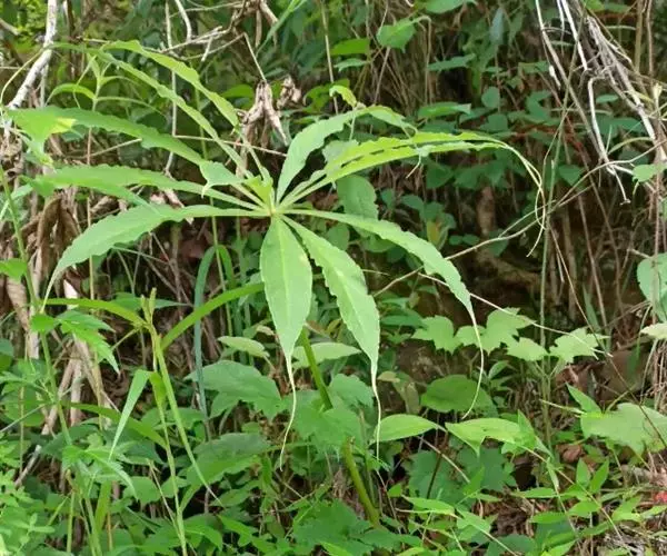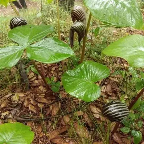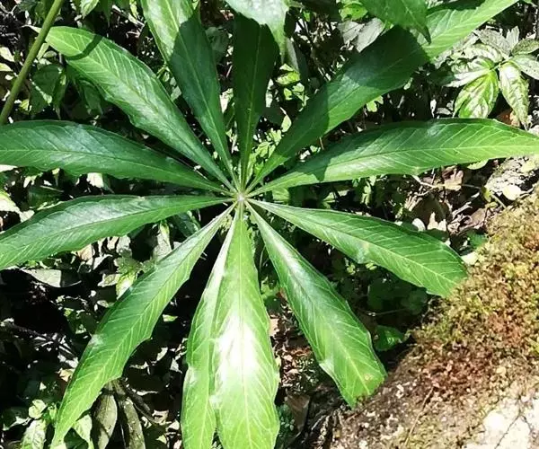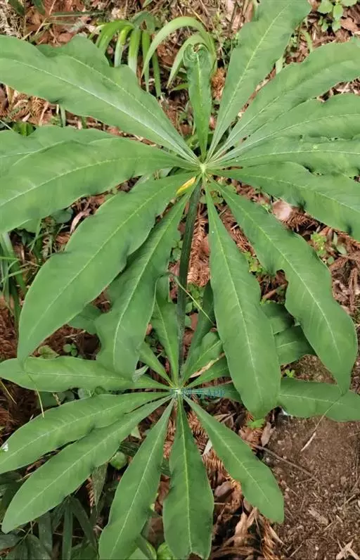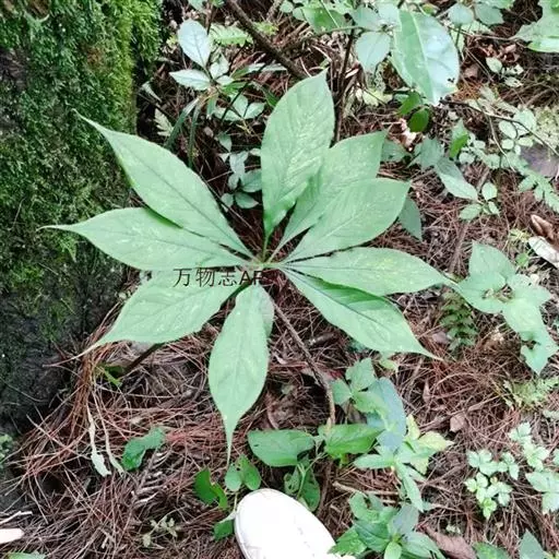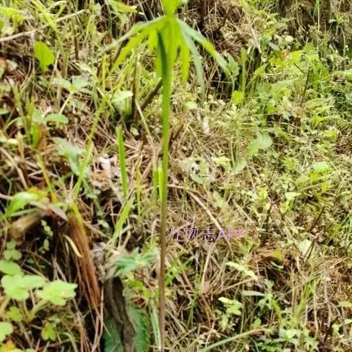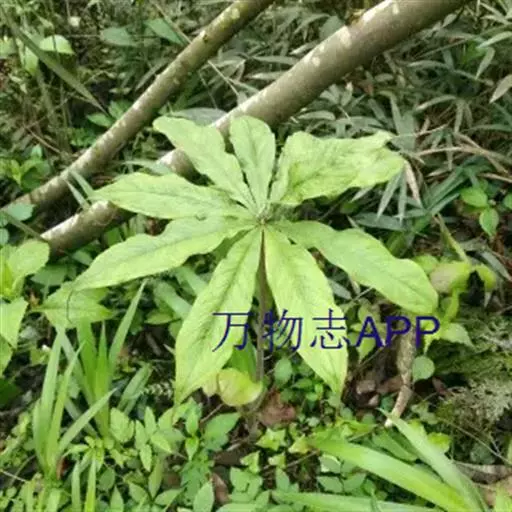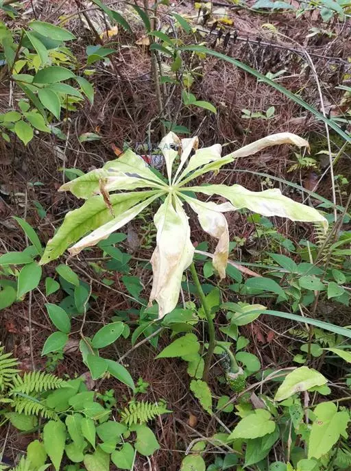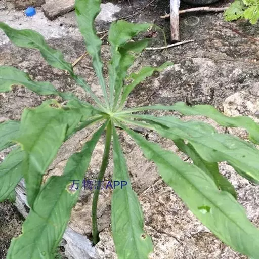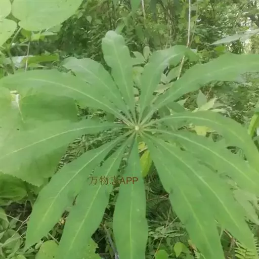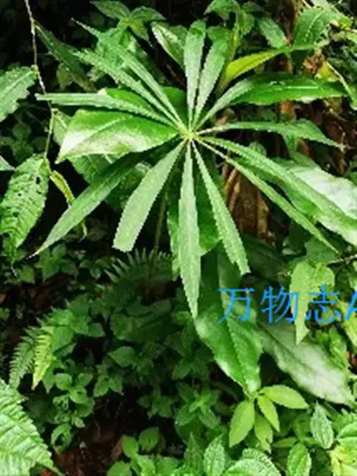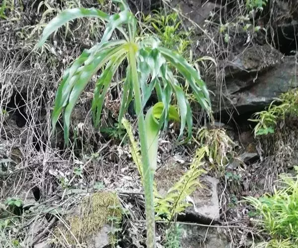 为天南星科天南星属的植物,有毒。多年生草本。块茎略呈球形,直径可达6厘米。叶1枚,小叶7~23枚,呈辐射状排列,形如一把伞,顶端细丝状,叶柄长,长40~80厘米。5~7月开花,雌雄异株,花序的佛焰苞为绿色或淡紫色,有白色条纹,肉穗花序的附属器棒状,顶端钝。浆果多数,成熟时为鲜红色。