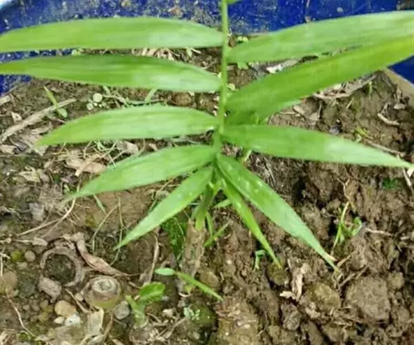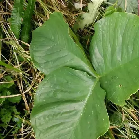 块茎扁球形,直径可达6厘米,表皮黄色,有时淡红紫色。鳞叶绿白色、粉红色、有紫褐色斑纹。叶1,极稀2,叶柄长40-80厘米,中部以下具鞘,鞘部粉绿色,上部绿色,有时具褐色斑块;叶片放射状分裂,裂片无定数;幼株少则3-4枚,多年生植株有多至20枚的,常1枚上举,余放射状平展,披针形、长圆形至椭圆形,无柄,长(6-)8-24厘米,宽6-35毫米,长渐尖,具线形长尾(长可达7厘米)或否。