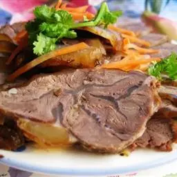 5.食用时先将整羊卧放于特制的木盘内,羊角系上红绸布,抬至餐室请宾客欣赏后,由厨师将羊皮剥下切成条装盘,再将羊肉割下切成厚片,羊骨剁成大块分别装盘,配以葱段、蒜泥、面酱、荷叶饼,并随带蒙古刀上桌。
