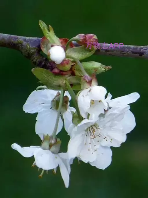 核果近球形或卵球形,红色至紫黑色,直径1.5-2.5厘米;核表面光滑。花期4-5月,果期6-7月。2n=16,24,32。