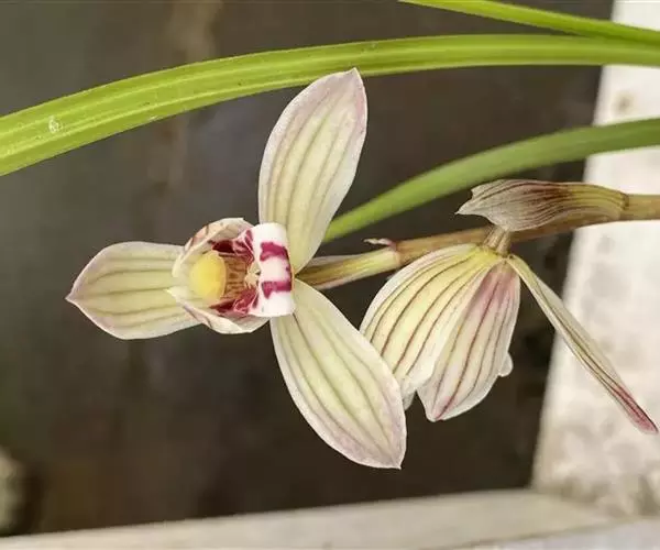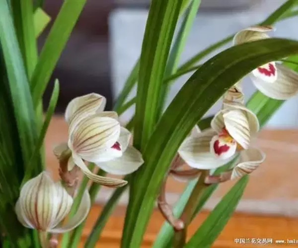 莲瓣兰的叶宽的大都在0.5cm左右,叶长40~50cm者居多,叶面顺滑,收脚紧,每叶的叶柄部刚劲有力,假鳞球大多错位分布,根粗壮,根尖部钝圆,莲瓣兰一箭多花,大多着花2~4朵,花色多为麻白,幽香、长椭圆瓣形居多。莲瓣兰的另一个典型特征是花瓣上有多条清晰的纵纹(舌瓣除外)。