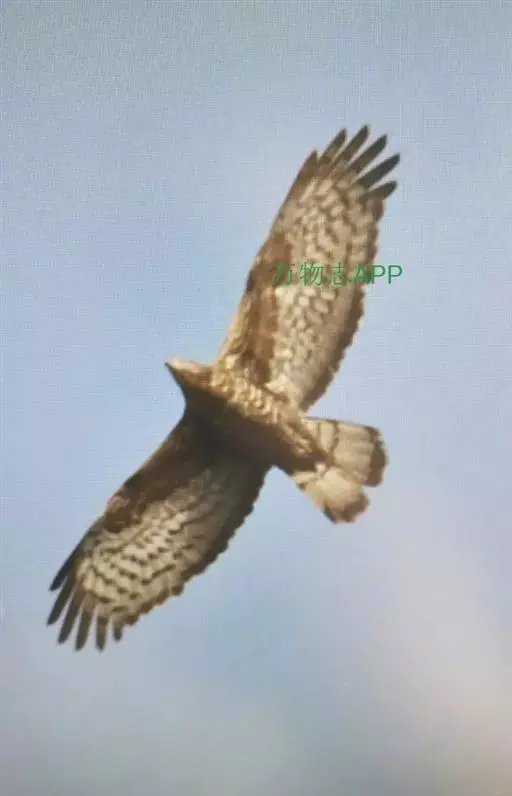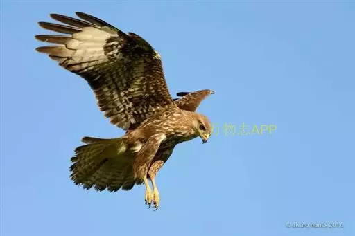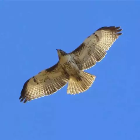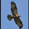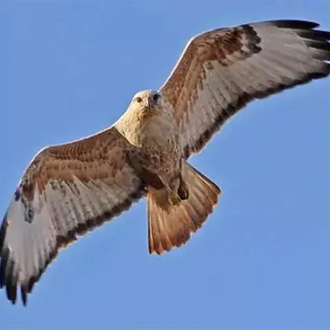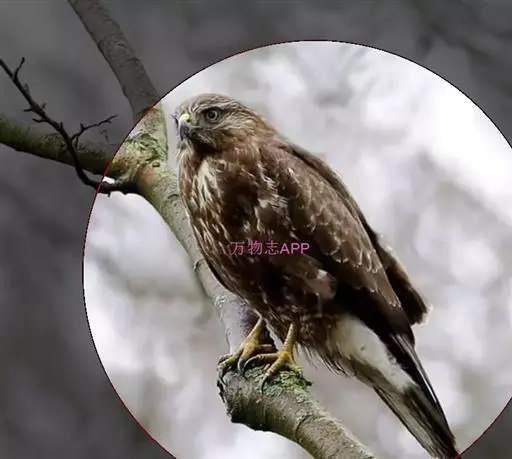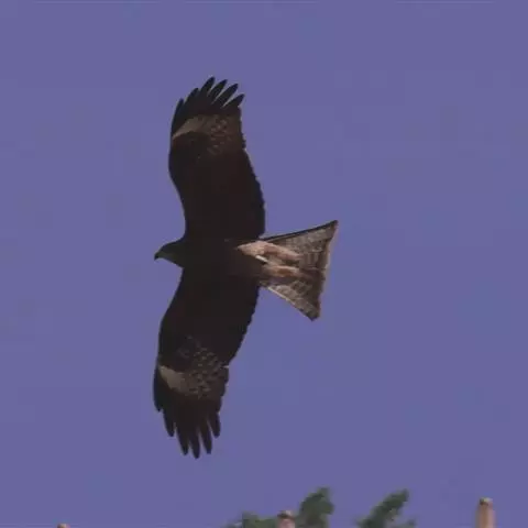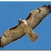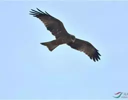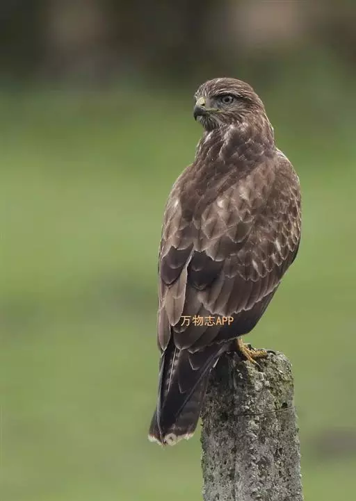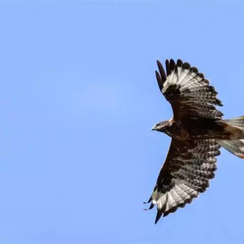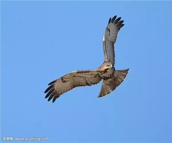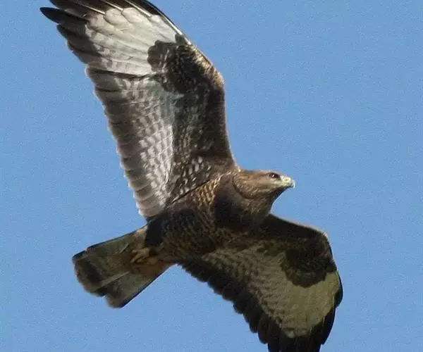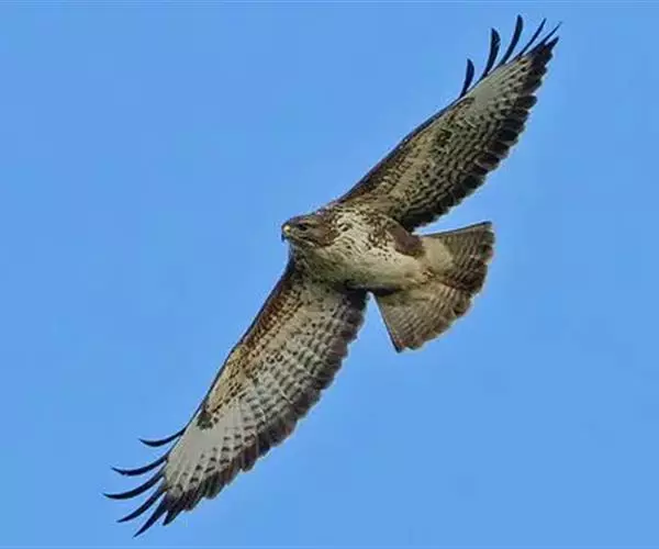 普通鵟(学名:Buteo buteo)属中型猛禽,体长50-59厘米。体色变化较大,上体主要为暗褐色,下体主要为暗褐色或淡褐色,具深棕色横斑或纵纹,尾淡灰褐色,具多道暗色横斑。飞翔时两翼宽阔,初级飞羽基部有明显的白斑,翼下白色,仅翼尖、翼角和飞羽外缘黑色 (淡色型)或全为黑褐色 (暗色型),尾散开呈扇形。翱翔时两翅微向上举成浅‘V’字形。