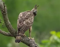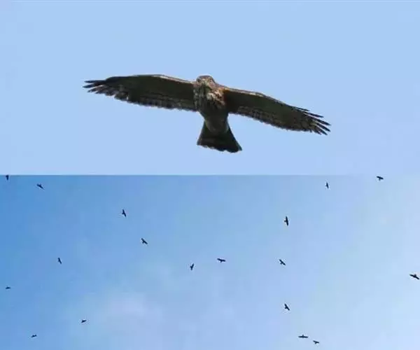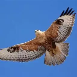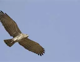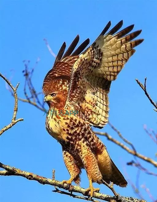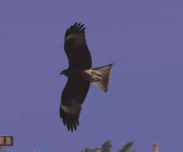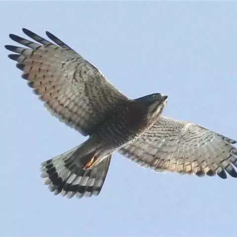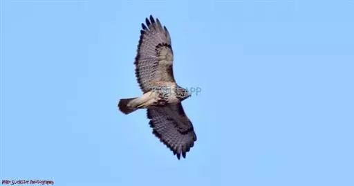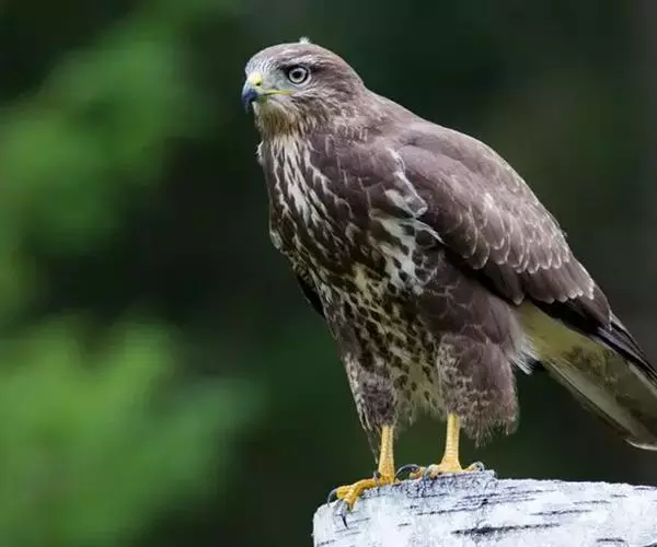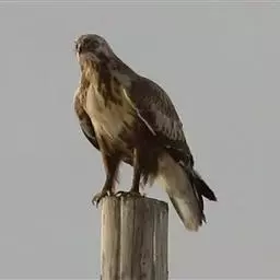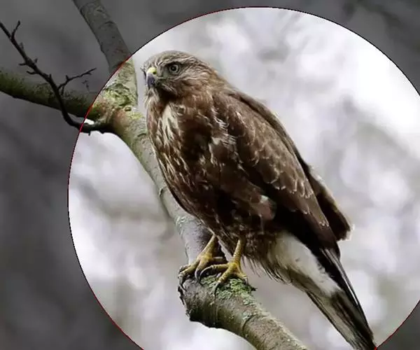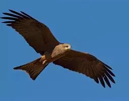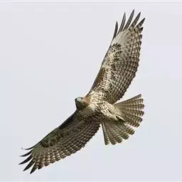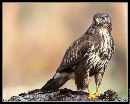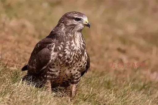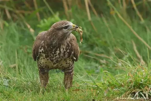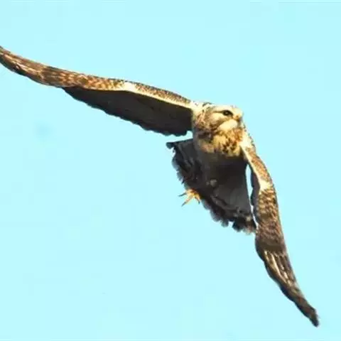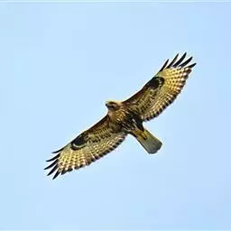 普通鵟(学名:Buteo buteo)属中型猛禽,体长50-59厘米。体色变化较大,上体主要为暗褐色,下体主要为暗褐色或淡褐色,具深棕色横斑或纵纹,尾淡灰褐色,具多道暗色横斑。飞翔时两翼宽阔,初级飞羽基部有明显的白斑,翼下白色,仅翼尖、翼角和飞羽外缘黑色 (淡色型)或全为黑褐色 (暗色型),尾散开呈扇形。翱翔时两翅微向上举成浅‘V’字形。