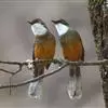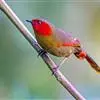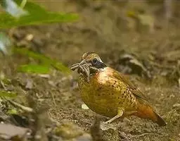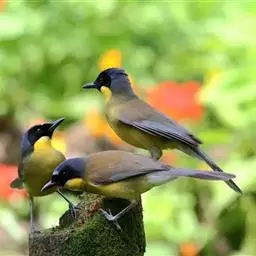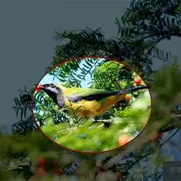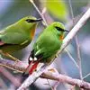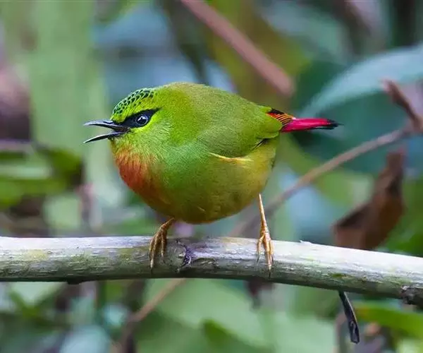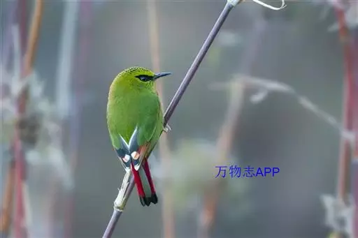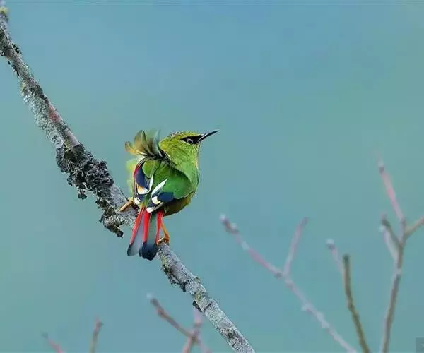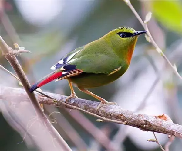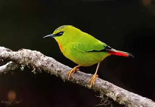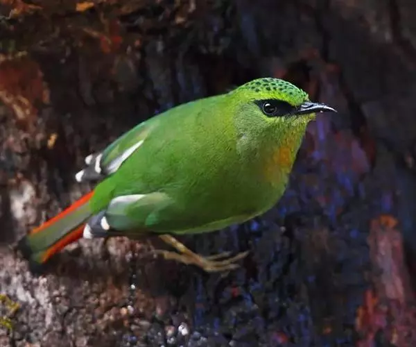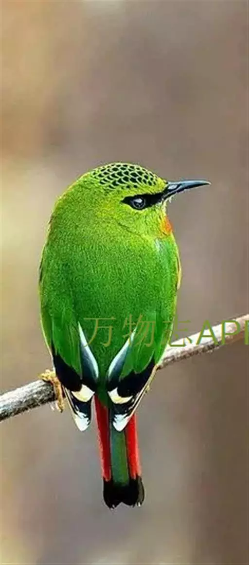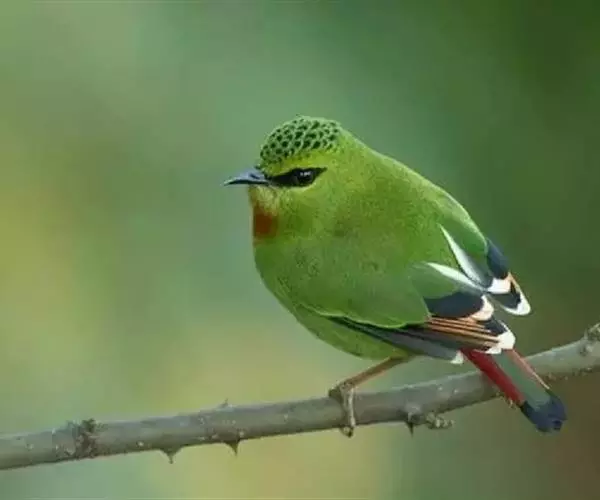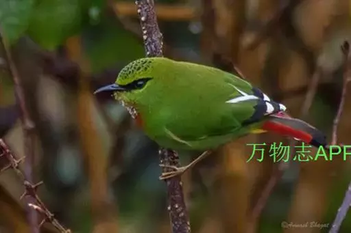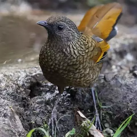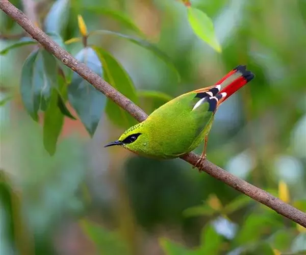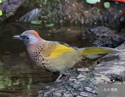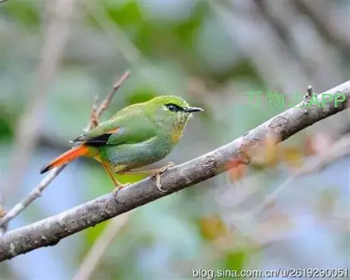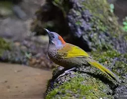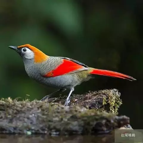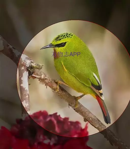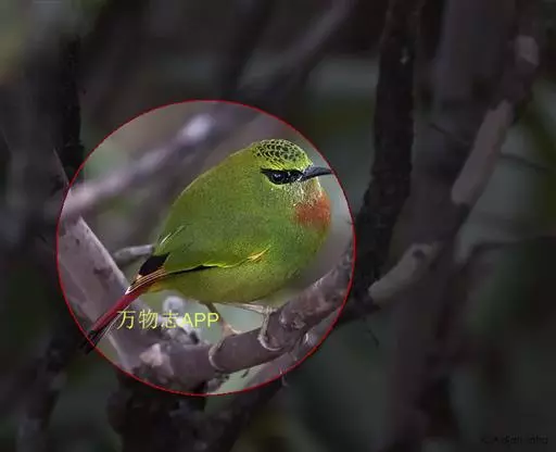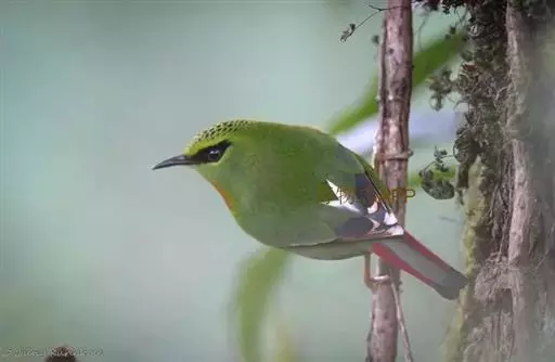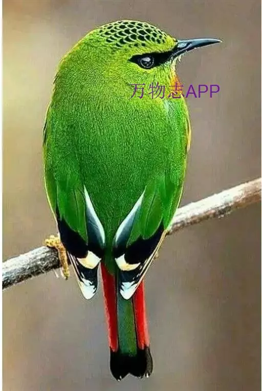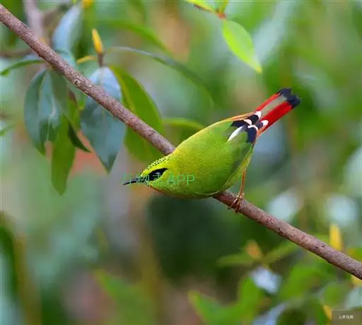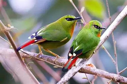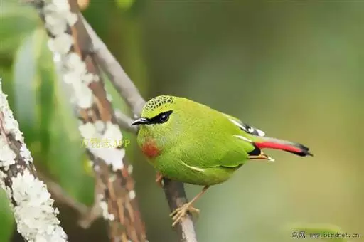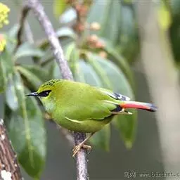 火尾绿鹛(图2) 雄性成鸟:体色一般为有光泽的橄榄黄色,眼先和眼后黑色,眉纹黄绿色;头顶羽毛中央有卵圆形黑斑,构成鳞片状的斑纹;翅上覆羽和尾上覆羽与背部相似,均为橄榄黄色;初级飞羽褐色,外翈深黑色,从第三或第四枚起,端部边缘浅肉黄色,内翈顶端白色;外侧次级飞羽褐色,外翈边缘暗朱红色,向端部渐变为橘黄色和白色,构成朱红色翼镜,最内侧次级飞羽内翈绿色,类似背部,外翈黑色;尾羽暗灰色,顶端微黑色,外翈红色,中央一对尾羽内翈绿色;喉和上胸棕红色;腹部和尾下覆羽棕黄色。 雌性成鸟:与雄鸟相似,但各部羽色较雄体暗些;头顶和背部橄榄绿色;翼镜不为朱红色,而是面积较小的褐黄色;其他各羽片颜色都较雄鸟淡些;翅端白色也较雄鸟面积小;喉部和尾下覆羽淡褐色;下体余部暗绿色微沾黄色。 虹膜红色或红褐色;嘴黑褐色;跗踱肉红色。