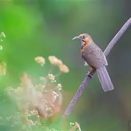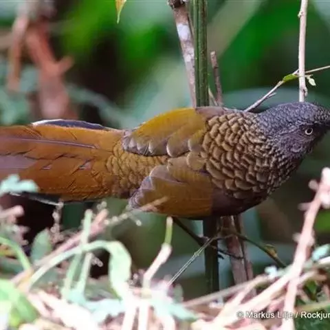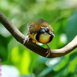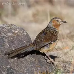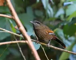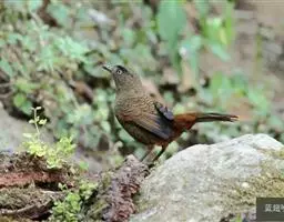 大噪鹛:中型鸟类,体长32-36厘米。额至头顶黑褐色,背栗褐色满杂以白色斑点,…