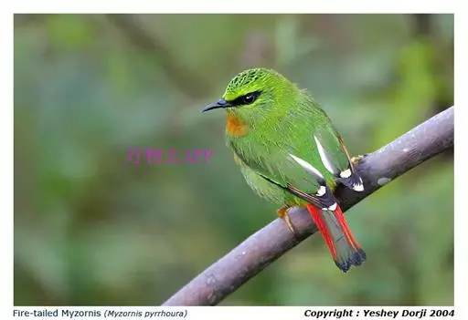 火尾绿鹛(学名:Myzornis pyrrhoura)是雀形目画眉科的鸟类,体小而不会被误认的亮丽绿色鹛。外侧尾羽红色,翼斑橙红。顶冠羽端黑色而成斑纹。分布于尼泊尔至中国西南及缅甸东北部。单独或结小群活动。栖于海拔3000~3660米的山区森林,冬季下至海拔2000米。与莺类或太阳鸟混群。从杜鹃丛中吸食花蜜。