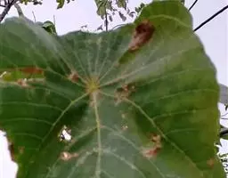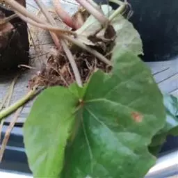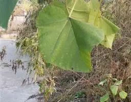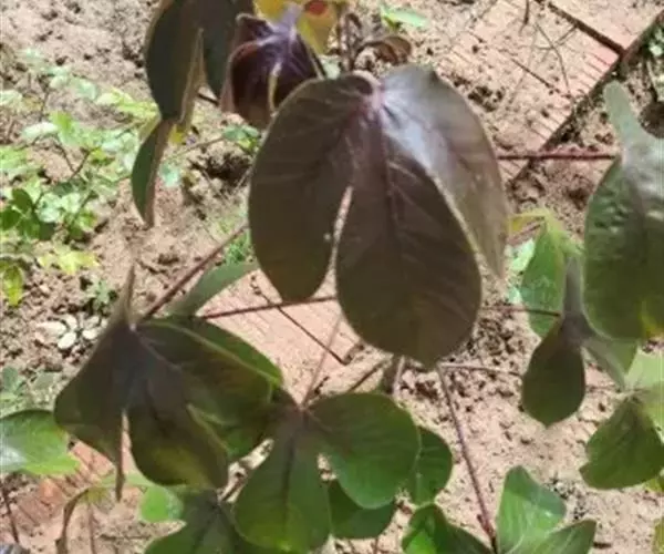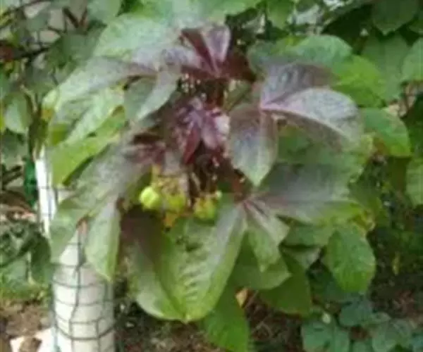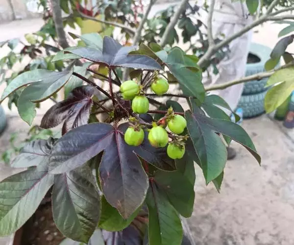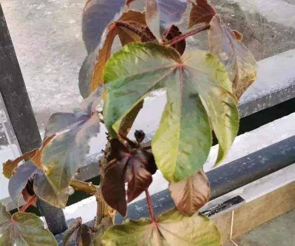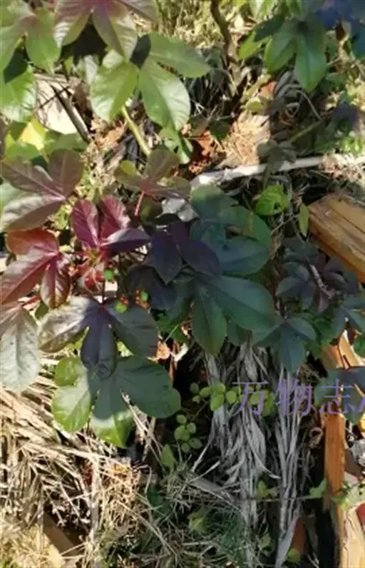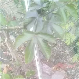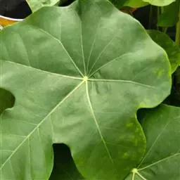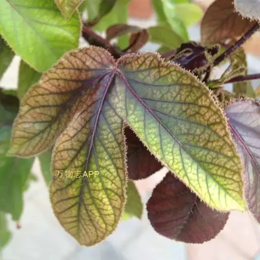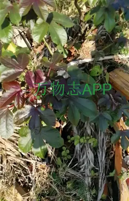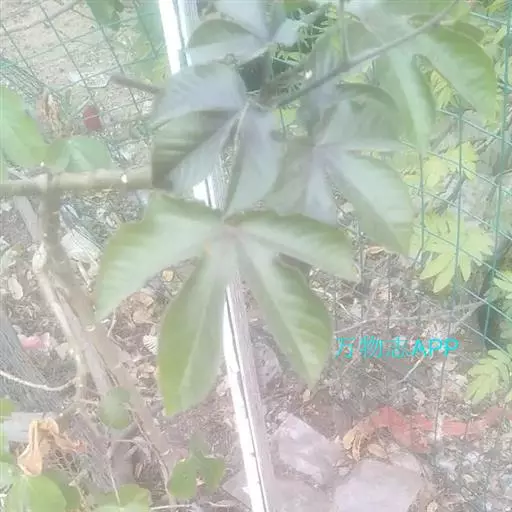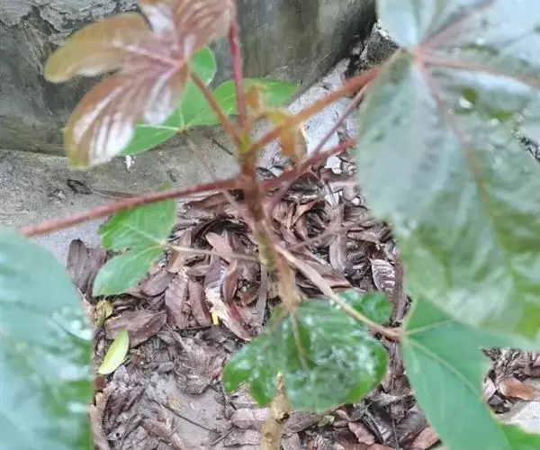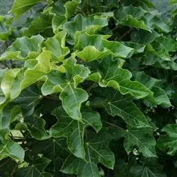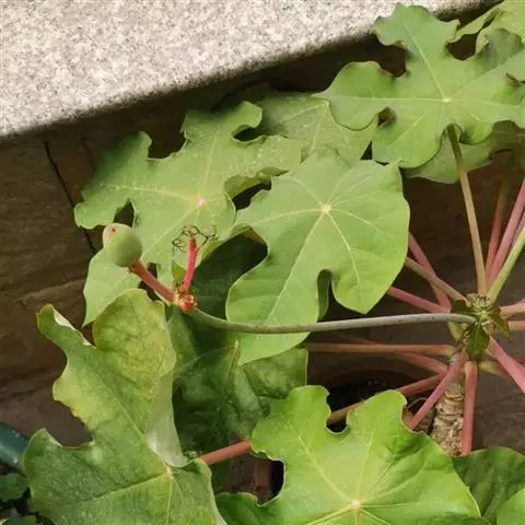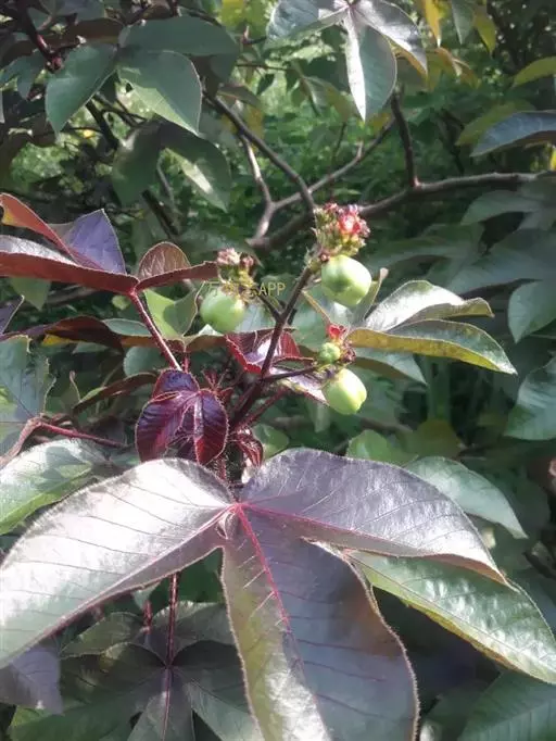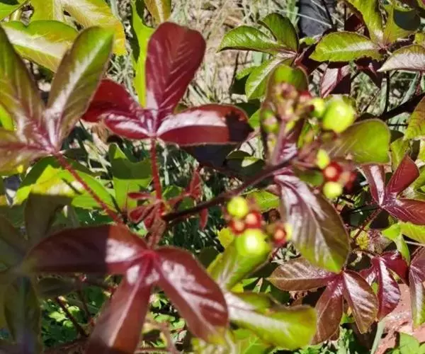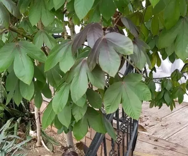 多年生落叶灌木或小乔木,株高2~6米。树皮光滑,苍白色;具乳汁,无毛。全株有毒。嫩叶紫红色,渐变绿色;叶背紫红色。单叶互生,近革质,掌状深裂3或4,裂片线状披针形或羽状,叶缘具锯齿,叶柄长10~25厘米,具刚毛,紫红色;托叶细裂为刚毛状,长约2厘米。