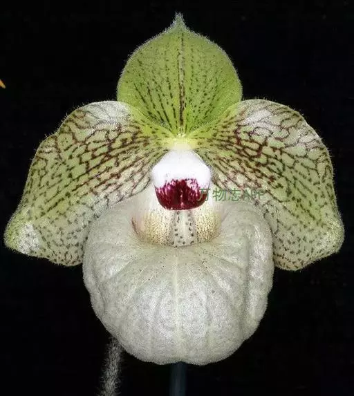 花葶直立,长(26-)30-40厘米,紫色,具锈色长柔毛,中部常有1枚不育苞片,顶端生1花;花苞片狭卵状披针形,长2-4厘米,绿色并具紫色斑点,背面被疏柔毛,边缘有缘毛;花梗和子房长3.5-4.5厘米,具长柔毛;花直径8-9厘米,黄绿色或淡绿色,花瓣上有紫褐色条纹或多少由斑点组成的条纹,唇瓣上有时有不甚明显的紫褐色斑点,退化雄蕊白色而近先端有深紫色斑块,较少斑块完全消失;中萼片椭圆状披针形,长3.5-4.5厘米,宽1.8-2.5厘米,先端渐尖或长渐尖,内表面疏被微柔毛,背面具长柔毛,边缘有缘毛;合萼片卵状披针形,长3.5-4.5厘米,宽2-2.5厘米,先端略2齿裂,内表面疏被微柔毛,背面具长柔毛并有不甚明显2条龙骨状突起,边缘亦具缘毛;花瓣倒卵形、卵形或椭圆形,长4-5厘米,宽2.5-3厘米,先端急尖或钝,两面被微柔毛,内表面基部有长柔毛,边缘具缘毛;唇瓣深囊状,近球形,长与宽各4-4.5厘米,囊口近圆形,整个边缘内折,囊底有长柔毛;退化雄蕊长圆状卵形,长达1.3厘米,宽1.1厘米,先端截形,基部近无柄,基部边缘有细缘毛,背面有龙骨状突起,上表面有4个脐状隆起,其中2个近顶端,另2个近基部。花期12月至次年3月。