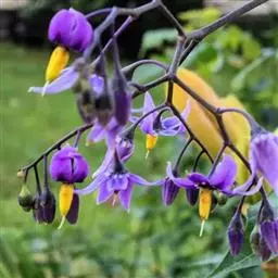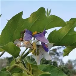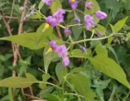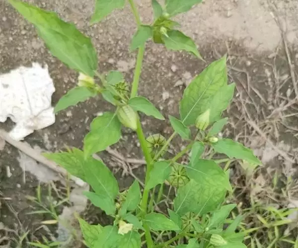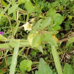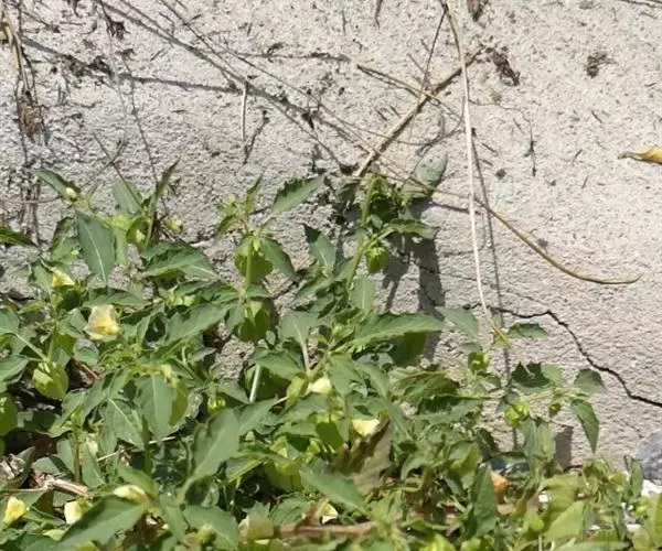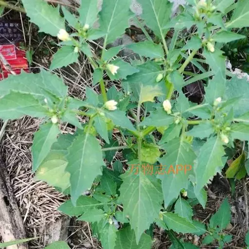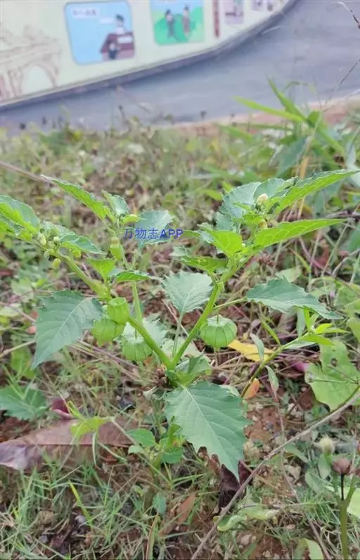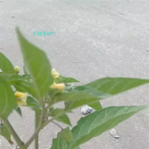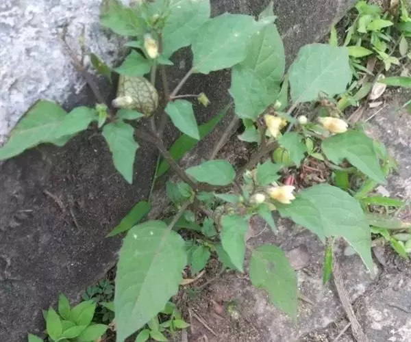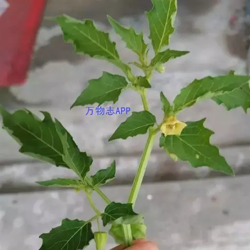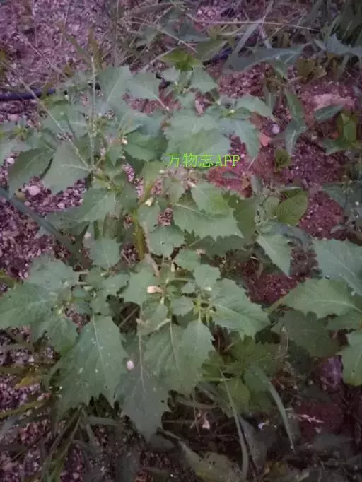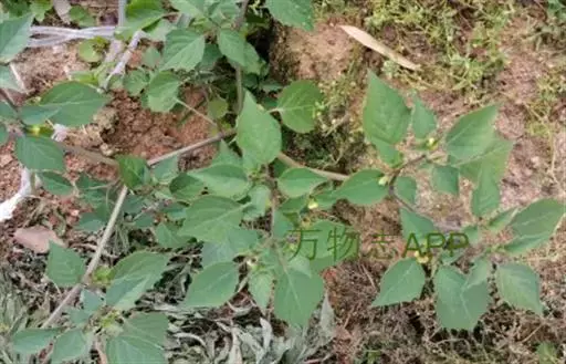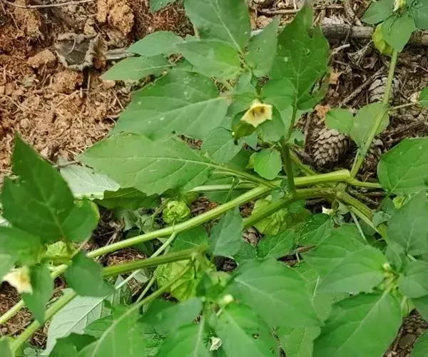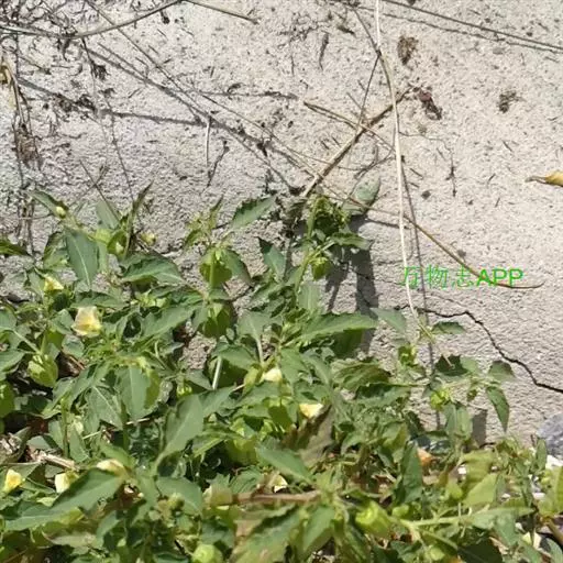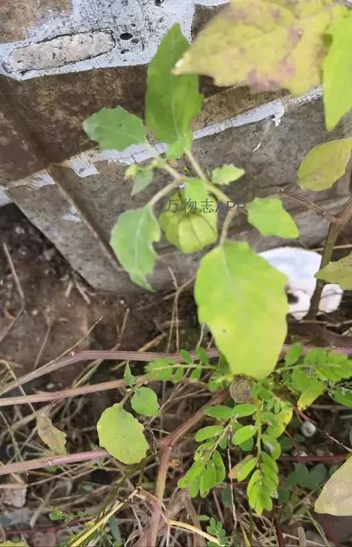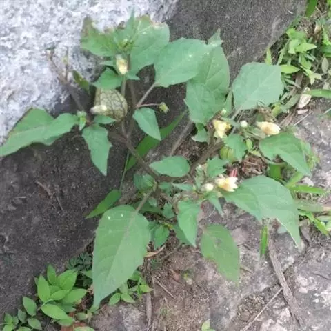 一年生草本,被疏短柔毛或近无毛,高常30-50厘米;茎多分枝,分枝纤细。叶柄长1-5厘米,叶片卵形至卵状椭圆形,顶端渐尖或急尖,基部阔楔形或楔形,全缘或有不等大的牙齿,两面近无毛,长3-6厘米,宽2-4厘米。花梗长约5-12毫米,纤细和花萼一样生短柔毛,长4-5毫米,5中裂,裂片披针形,生缘毛;花冠淡黄色,喉部常有紫色斑纹,长4-6毫米,直径6-8毫米;花药蓝紫色或有时黄色,长约1.5毫米。果萼卵球状,直径1.5-2.5厘米,薄纸质,浆果直径约1.2厘米。种子圆盘状,长约2毫米。花果期5-12月。