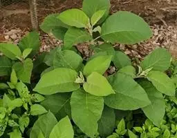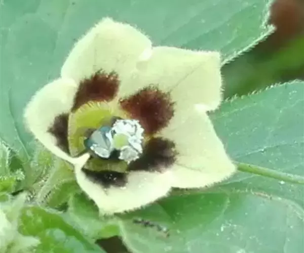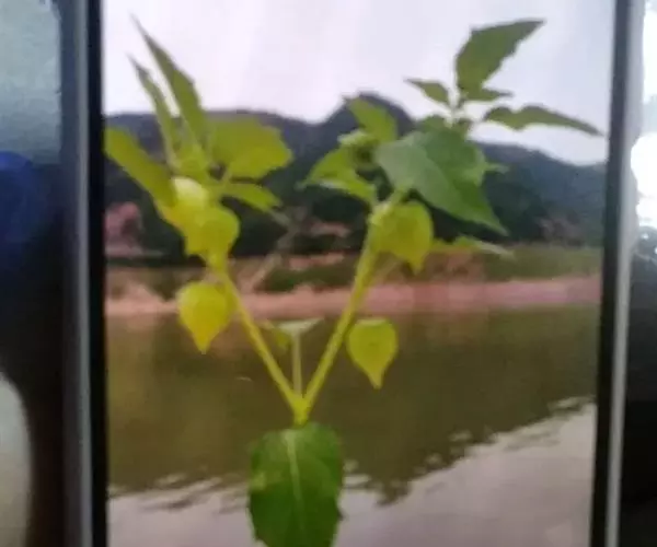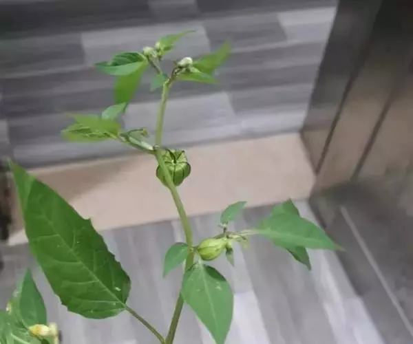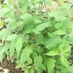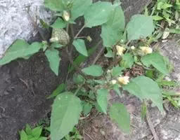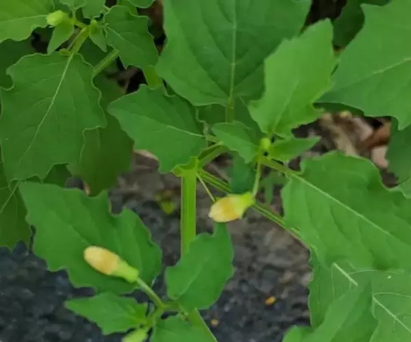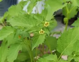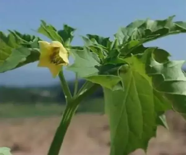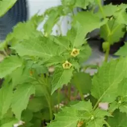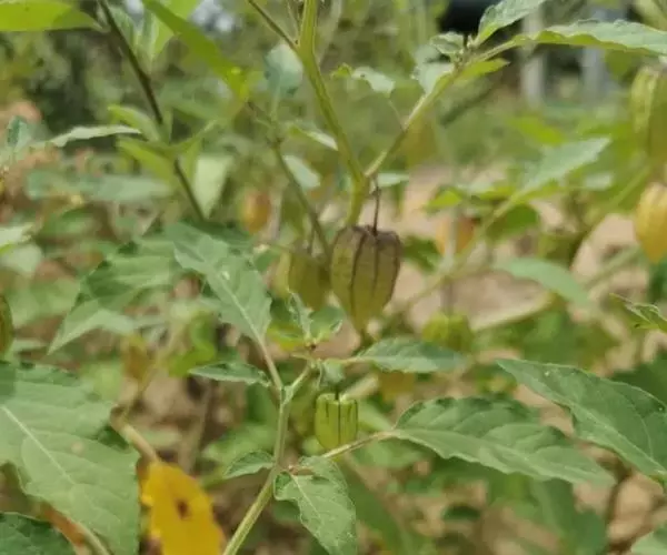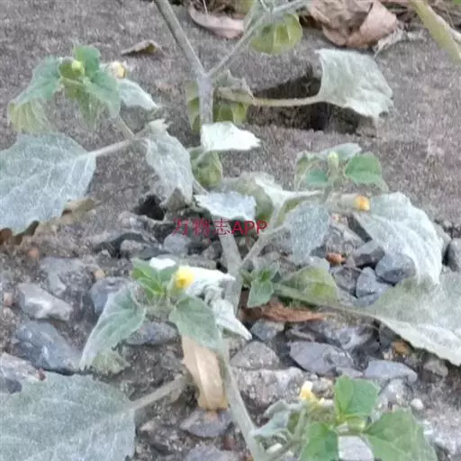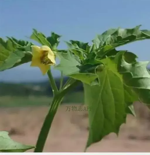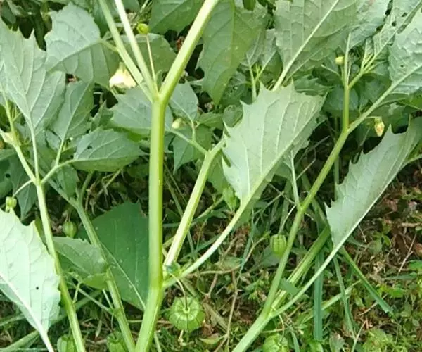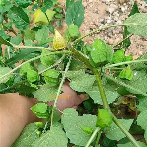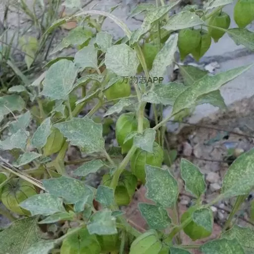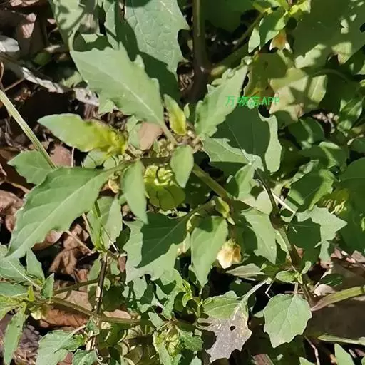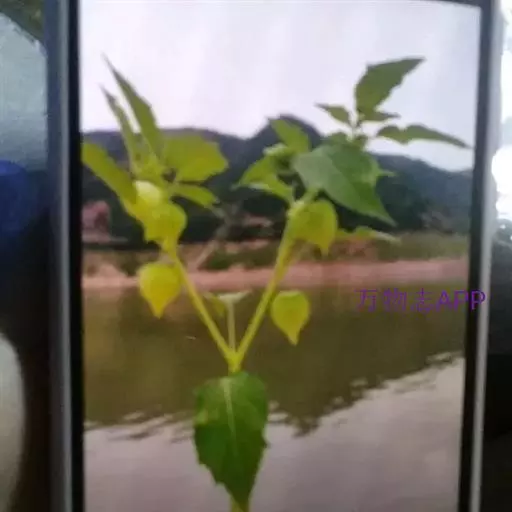 茎有分枝,具细柔毛或近光滑,叶互生,黄绿色,多皱缩或脱落,完整者卵形,长3-6cm,宽2-4cm(用水泡开后展平),先端渐尖,基部偏斜,全缘或有疏锯齿,厚纸质;叶柄1-3cm。花淡黄棕色,钟形,先端5裂。有的可见果实,球形,橙红色,外包淡绿黄色膨大的宿萼,长约2.5cm,有5条较深的纵棱。气微,味苦。