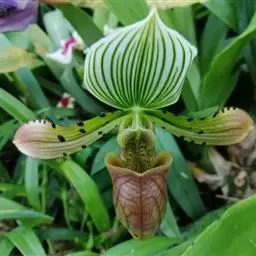 紫纹兜兰 Stein)是兰科兜兰属的地生或半附生植物。叶基生,叶片狭椭圆形或长圆状椭圆形,…
