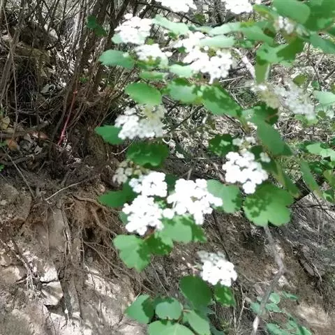 中华绣线菊(学名:Spiraea chinensis Maxim.):蔷薇科、绣线菊属灌木,高可达3米;小枝红褐色拱形弯曲,冬芽卵形,叶片菱状卵形至倒卵形,上面暗绿色,下面密被黄色绒毛,叶柄被短绒毛。伞形花序,苞片线形,萼筒钟状,萼片卵状披针形,花瓣近圆形,白色;花盘波状圆环形或具不整齐的裂片;子房具短柔毛,蓇葖果开张,3-6月开花,6-10月结果。