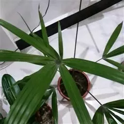 细叶棕竹,灌木,茎细如竹,多数聚生,有网状叶鞘。叶半圆形,掌状深裂,裂片狭长,阔线形,软垂,裂片7…