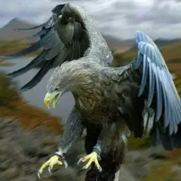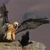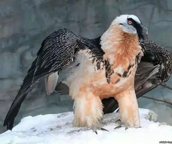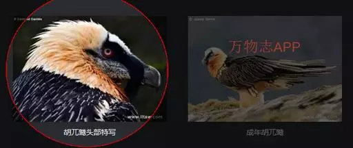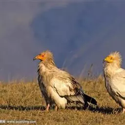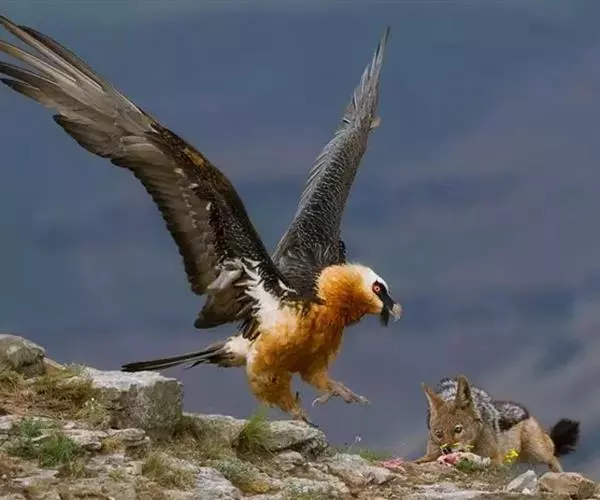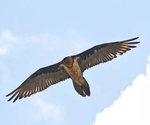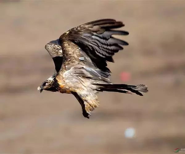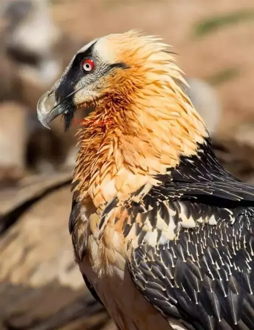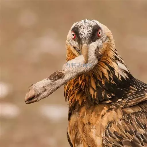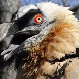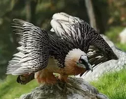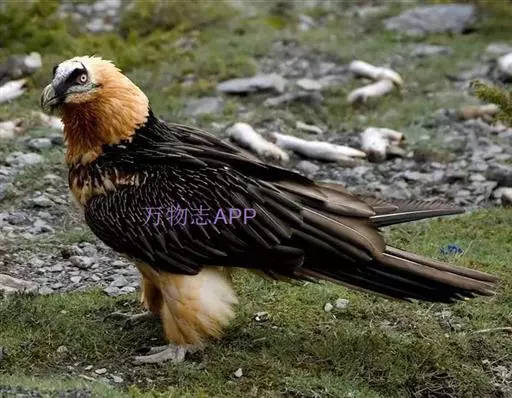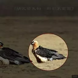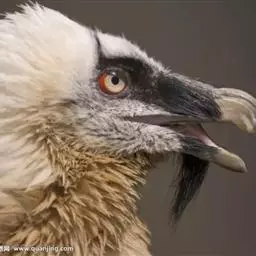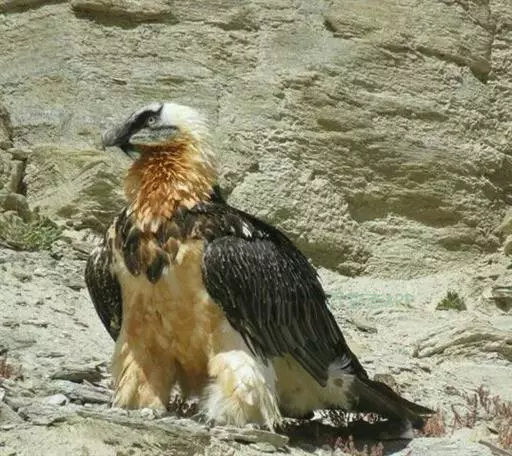 胡兀鹫(学名:Gypaetus barbatus):也名胡秃鹫,体重3.5-5.6千克;体长1-1.4米。全身羽色大致为黑褐色。它的名字因吊在嘴下的黑色胡须而得。头灰白色,有黑色贯眼纹,向前延伸与颏部的须状羽相连。后头、颈、胸和上腹红褐色,后头和前胸上有黑色斑点。体型一般是雌鸟比雄鸟稍大。
