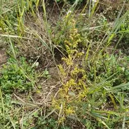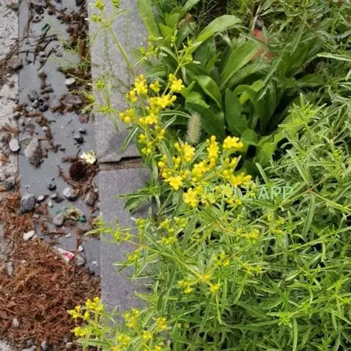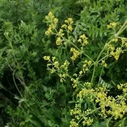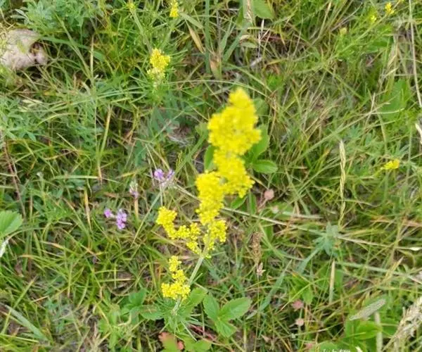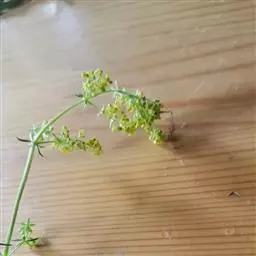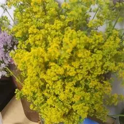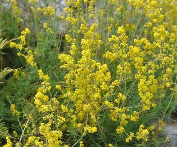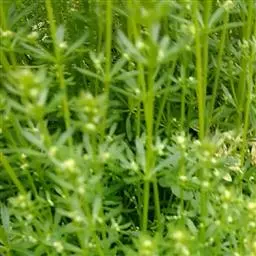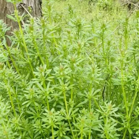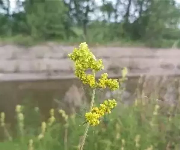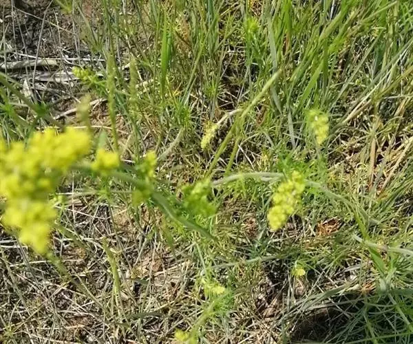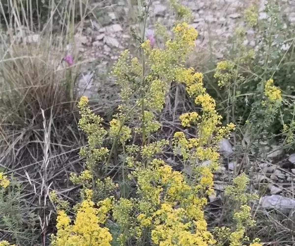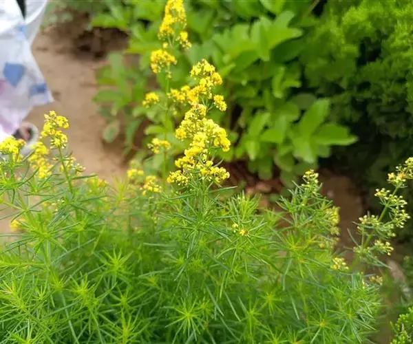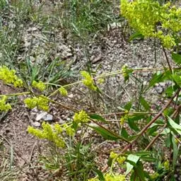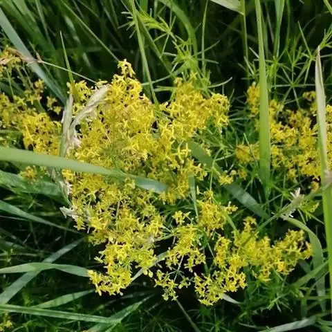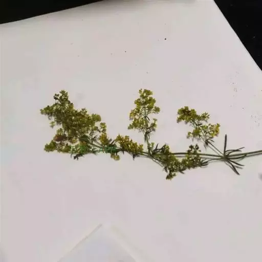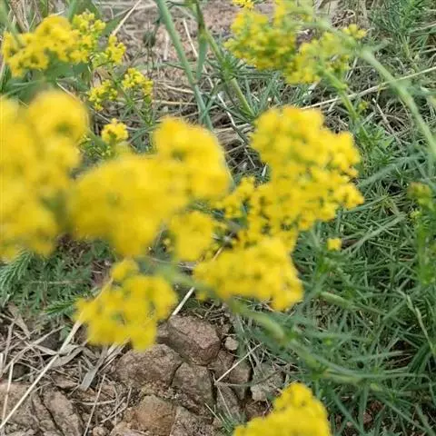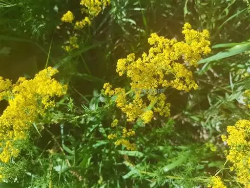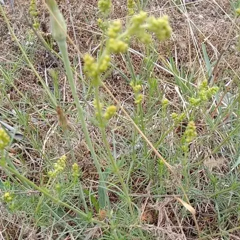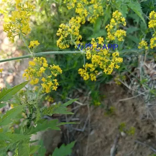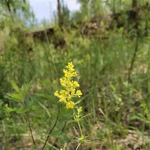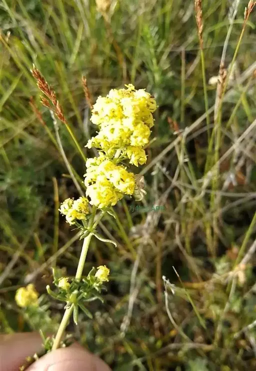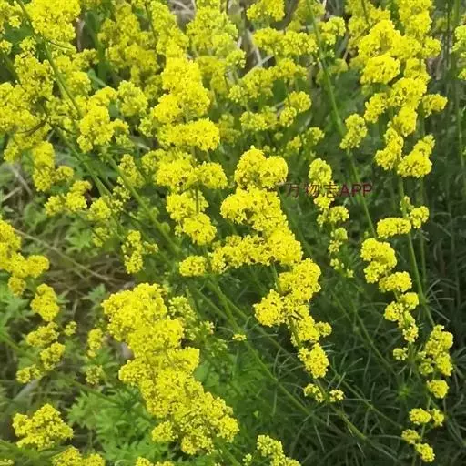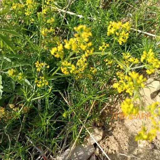 蓬子菜,又名黄牛尾。多年生直立草本。根茎粗短,根圆柱形,粗长而弯曲,稍木质。茎丛生,基部稍木质化,四棱形,幼时有柔毛。叶6-10片,轮生;无柄;叶片线形,长1-5cm,宽1-2mm,先端急尖,上面稍有光泽,仅下面沿中脉二侧被柔毛,边缘反卷。聚伞花序集成顶生的圆锥花序状,稍紧密;花序梗有灰白色细毛;花具短柄;萼筒全部与子房愈合,无毛;花冠辐状,淡黄色,花冠筒极短,裂片4,卵形,雄蕊4,子房2室,花柱2,柱头头状。双悬果2,扁球形,直径约1.8-2mm,无毛。花期6-7月,果期8-9月。