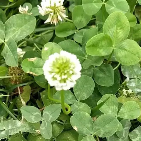 白车轴草,豆科车轴草属的多年生草本植物,茎贴地匍匐;叶柄直立,小叶心形,边缘具细齿,叶脉明显,…