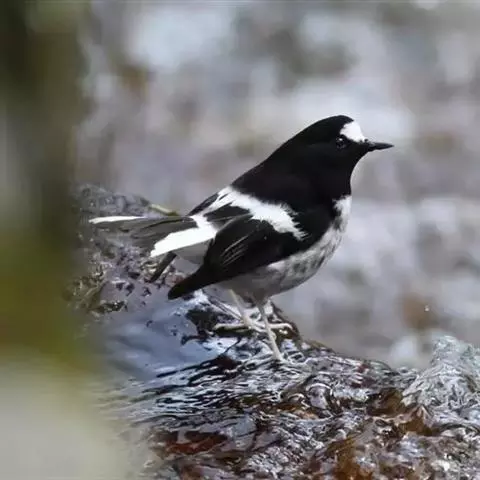 白喉红尾鸲,小型鸟类,体长14-16厘米。雄鸟额至枕钴蓝色,头侧、背、两翅和尾黑色,翅上有一大形白斑,…