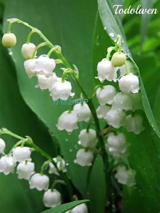 铃兰(学名:Convallaria majalis Linn.)又名君影草、山谷百合、风铃草。气味甜,全株有毒。多年生草本。植株矮小,全株无毛,地下有多分枝而匍匐平展的根状茎。具光泽。呈鞘状互相抱着,基部有数枚鞘状的膜质鳞片。叶椭圆形或卵状披针形,花钟状,下垂,总状花序,苞片披针形,膜质,花柱比花被短。入秋结圆球形暗红色浆果,有毒,内有椭圆形种子,扁平。花果期5~7月。