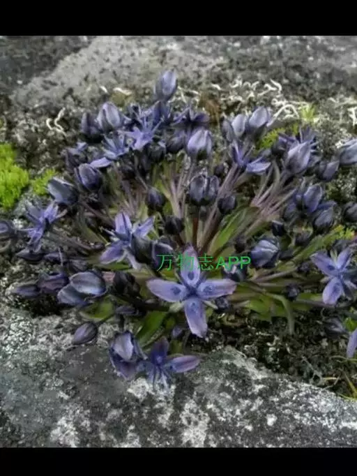 多年生草本,高8-12厘米。根肉质,粗壮,直径5-10毫米。茎多数,丛生,近等长,细瘦,状如总花梗,上部聚伞状分枝。叶大部分基生,莲座状,匙形或矩圆状匙形,长1.5-3.5厘米,宽0.5-1.2厘米,先端圆形或钝,边缘微粗糙,基部渐狭成柄,叶脉3-7条,弧形,较明显;茎生叶极少,苞叶状。聚伞花序生分枝顶端,具1-3(4)花;花梗长2-4.5厘米,不等长;花4数;花萼长为花冠的2/3,裂片矩圆形或披针形,长5-7毫米,先端钝或急尖,边缘粗糙;花冠蓝紫色,裂片矩圆形,长(8)10-11毫米,先端钝,基部具1个椭圆形、周缘具长柔毛状流苏的腺窝;花丝线形,长约5毫米,花药深蓝色,长约2.5毫米。蒴果披针形,长约1.5厘米;种子褐色,近球形,表面平滑。花果期6-9月。