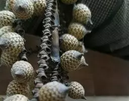 多个花序从顶部叶腋中同时抽出,粗壮,下垂,长1到4米,整个花序轴为许多大的苞片状的佛焰苞包着,每个佛焰苞内着生1个穗状花序,长10-15厘米,雄花着生于上部,雌花着生于基部;雄花较小,长5-8毫米,稍弯曲,雄蕊(6-)9,花丝粗;雌花较长,长约2厘米,花萼浅3齿裂,花冠略长于花萼,分裂成3个半裂的尖裂片。果实椭圆形或倒卵球形,长约6厘米或更长,直径4.2-4.8厘米,被覆瓦状排列的稍凸起的鳞片9纵列,鳞片中央有宽的沟槽,淡褐色,边缘具稍宽的暗褐色的流苏,果顶具短尖的喙。种子卵状长椭圆形,顶端变狭,钝头,长约5.5厘米,直径3-3.5厘米,胚乳嚼烂状,胚侧生于中部。花期3-5月,果期为第三年的3-10月。