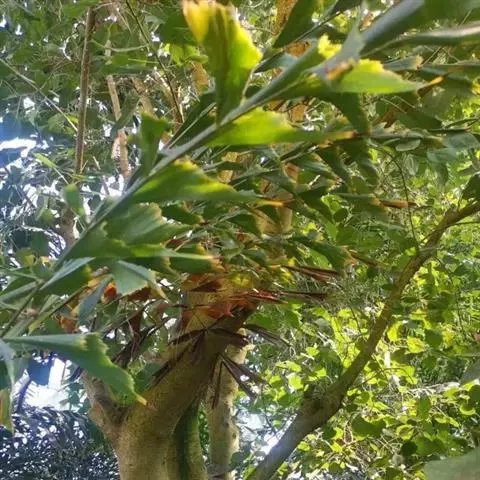 酒椰,茎直立,中等乔木状,高达5-10米。叶为羽状全裂,全长12-13米;羽片线形,长1.2-2米,宽3-5厘米,中脉及边缘具刺,上面绿色,背面灰白色;叶柄粗壮,长达1.5-1.8米,基部边缘成撕裂纤维状。