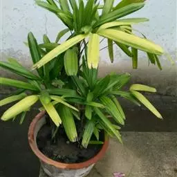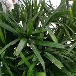 细叶棕竹,灌木,茎细如竹,多数聚生,有网状叶鞘。叶半圆形,掌状深裂,裂片狭长,阔线形,软垂,裂片7…