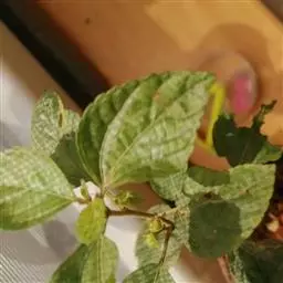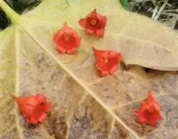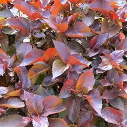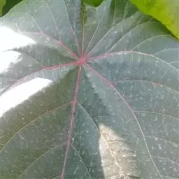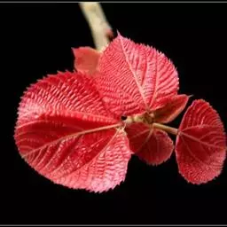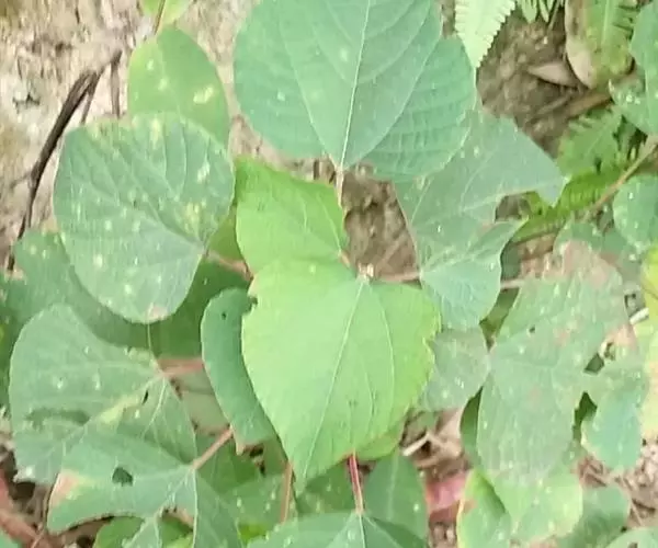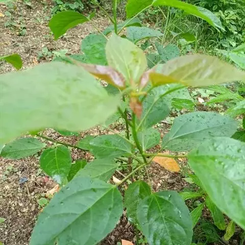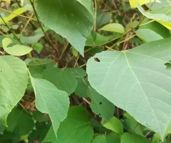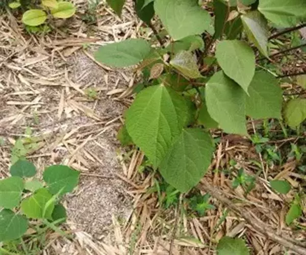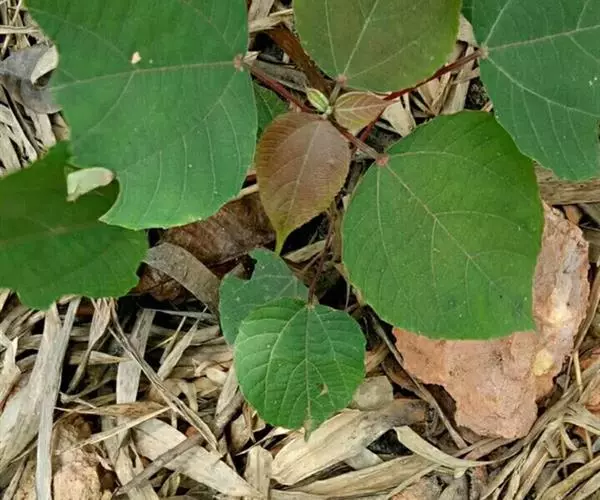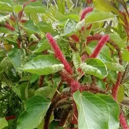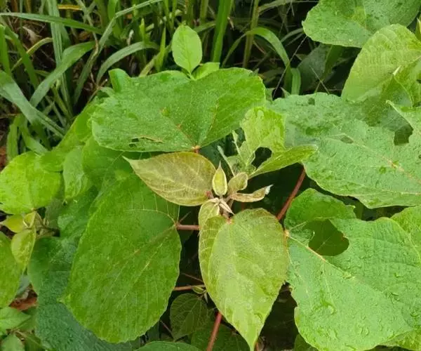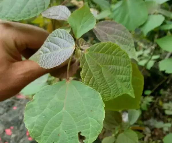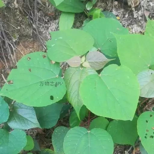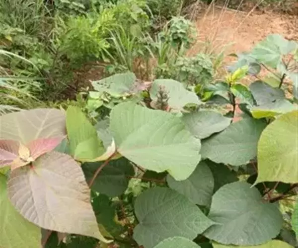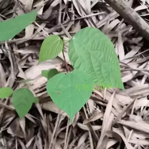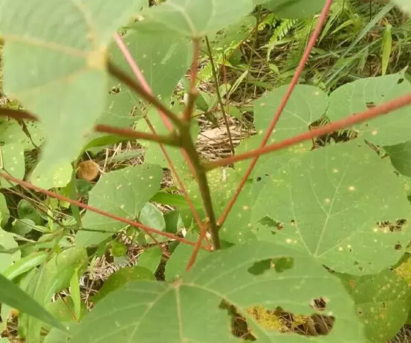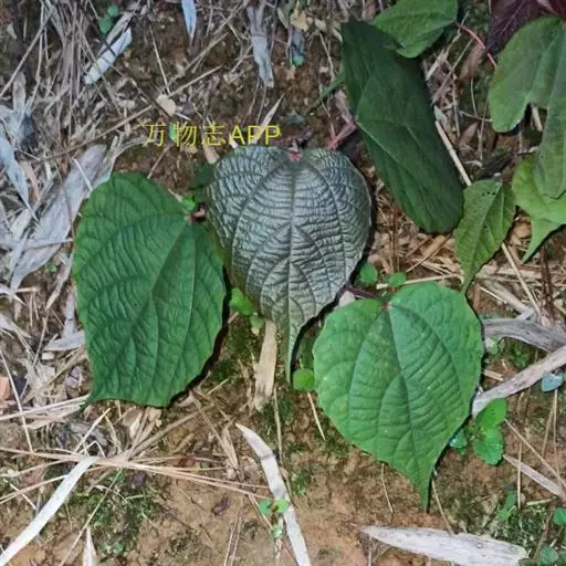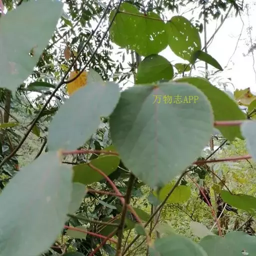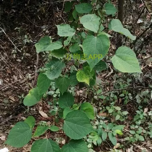 灌木,高1-2米;小枝被灰色微柔毛,后变无毛。叶薄纸质,阔卵形,长8-15厘米,宽7-13厘米,顶端急尖或渐尖,基部浅心形或近截平,边缘疏生具腺小齿,上面无毛,下面浅红色,仅沿脉被微柔毛,基部具斑状腺体4个;基出脉3条;小托叶披针形,长2-3.5毫米;叶柄长7-12厘米;托叶钻状,长3-5毫米,具毛,凋落。雌雄异株,雄花序穗状,腋生或生于一年生小枝已落叶腋部,长7-15厘米,具微柔毛,苞片三角形,长约1毫米,雄花(3-5) 11-15朵簇生于苞腋;花梗长约2毫米,无毛,中部具关节;雌花序总状,顶生,长5-6厘米,具花5-12朵,各部均被微柔毛,苞片狭三角形,长约4毫米,基部具腺体2个,小苞片披针形,长约3毫米;花梗长1毫米;雄花:花萼花蕾时球形,无毛,直径1.5毫米,萼片4枚,长圆形;雄蕊(7-)8枚;雌花:萼片5 (-6)枚,披针形,长3-4毫米,被短柔毛,其中1枚的基部具1个腺体;子房球形,被短绒毛,花柱3枚,线状,长12-15毫米,合生部分长不及1毫米。蒴果球形,具3圆棱,直径8-10毫米,果皮平坦,被微柔毛;种子扁卵状,长6毫米,种皮浅褐色,具瘤体。花期3-5月,果期6-8月。