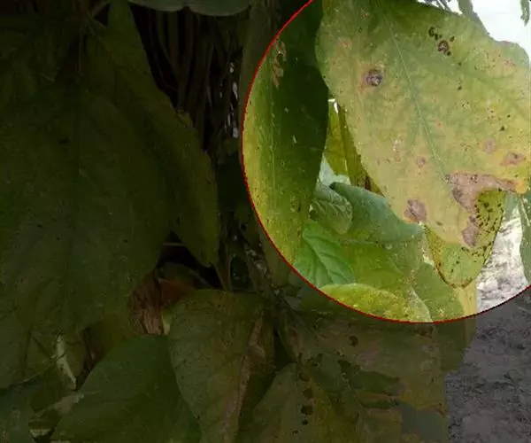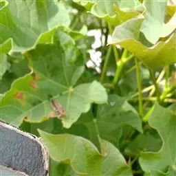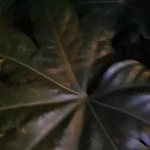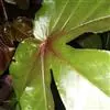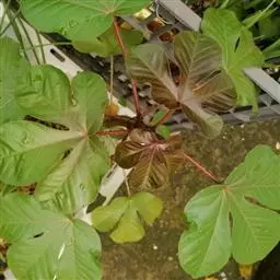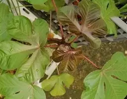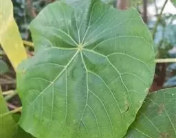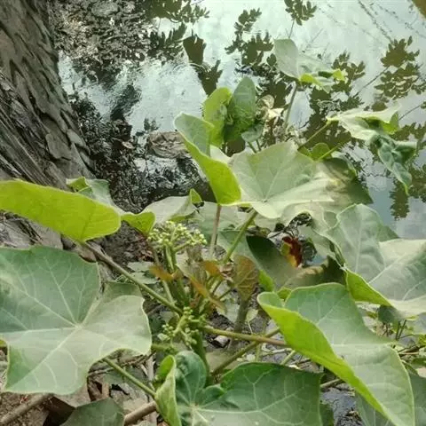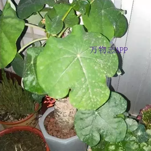叶盾状着生,轮廓近圆形至阔椭圆形,长8-18厘米,宽6-16厘米,顶端圆钝,基部截形或钝圆,全缘或2-6浅裂,上面亮绿色,下面灰绿色,两面无毛;掌状脉6-8,其中上部3条直达叶缘;叶柄长8-16厘米,无毛;托叶分裂呈刺状,宿存。